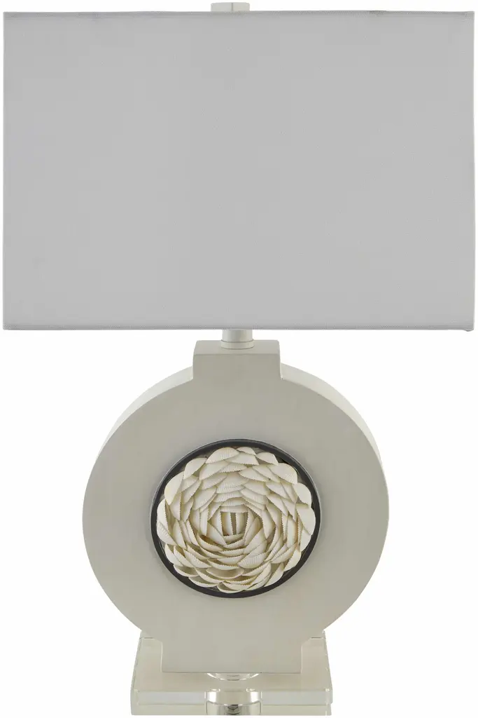 Collection: Novodvinsk Colors: White, Clear, Metallic - Nickel, Translucent Material: Body: Resin, Shell / Base: Crystal / Shade (Outside): Linen, Polyester / Shade (Inside): Polyester / Finial: Plastic Styles: Contemporary Made In: China Lighting Type: Accent Table Lighting Base: Crystal Base Color: Clear Shade Material: Linen, Polyester, Polyester Shade Color: White, White Cord Length: 6' Switch Type: Rotary Number of Bulbs: 1 Socket Type: E-26 Bulb Wattage: 60W