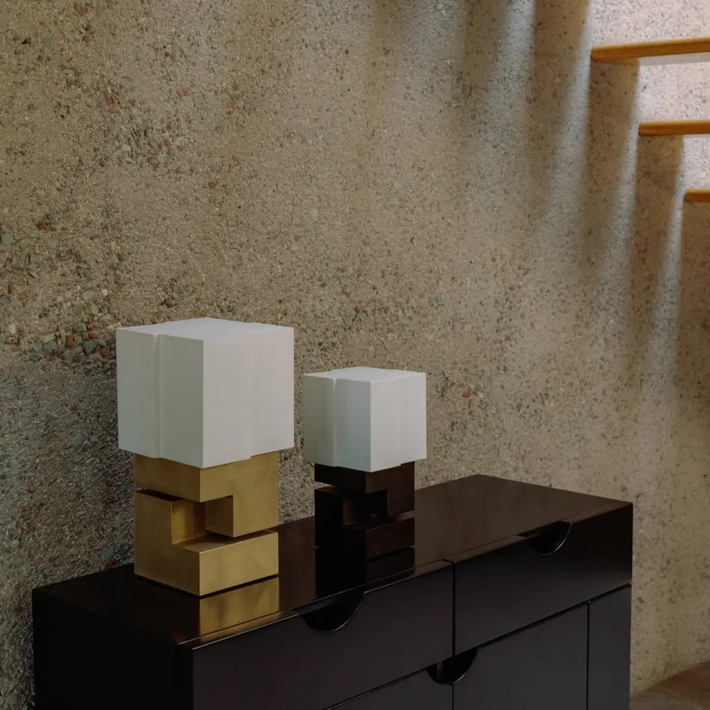 The Nucleo Accent Lamp beautifully blends cast sculpture with monolithic Brutalist architecture. Its staggered-geometric linen shade gracefully mirrors the intersecting, cantilevered forms of the solid, textural metal base, creating a harmonious design. With fabric-wrapped chording and a linen diffuser atop the shade to obscure the internal light source, this dimmable table lamp is perfectly suited for any bedroom, living room, or console.