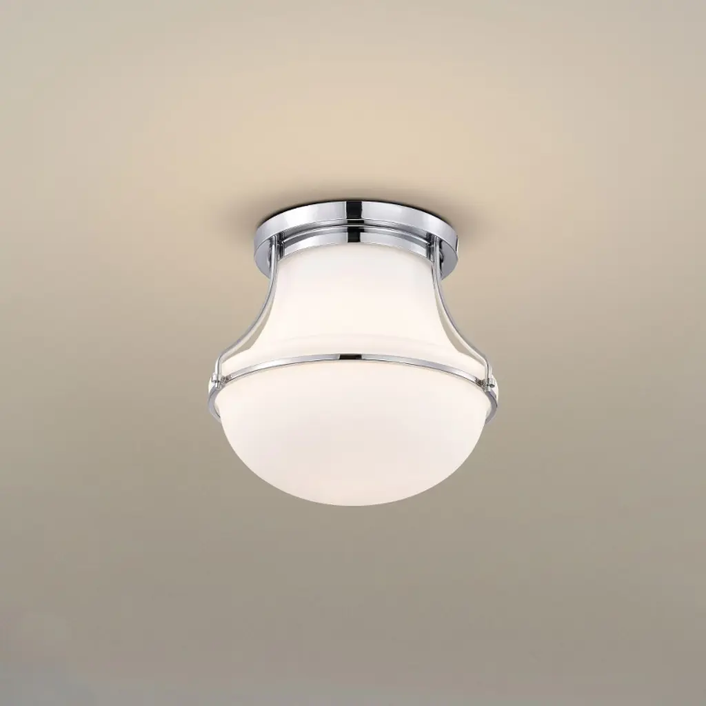 Collection: Valdora, Material: Steel, Finish Color: Polished Nickel, Width: 10.38", Height: 9", Length: 10.38", Lamping Type: Incandescent, Number Of Bulbs: 1, Wattage: 60 Watts, Dimmable: Yes, Moisture Rating: Damp Rated, Desc: Evoke a sense of tranquility with the Valdora 60-7860 small flush mount, which pays homage to classic, luminous illumination. A schoolhouse-inspired shade floats in a rich finish of natural brass, perfectly complimenting the fixture base and white hue of the glass. Transform the rooms in your home with harmonious fixtures, paying homage to traditional style but designed for today's style. Accepts one 60 watt A19 medium base bulb or LED equivalent / Steel Construction / White Opal Glass / Natural Brass Finish / Damp Location Rated / 1 Year Warranty / Instructions and mounting hardware included for easy installation / Experience the perfect blend of style and functionality with the Valdora collection, tailored to suit your unique taste and elevate your living
