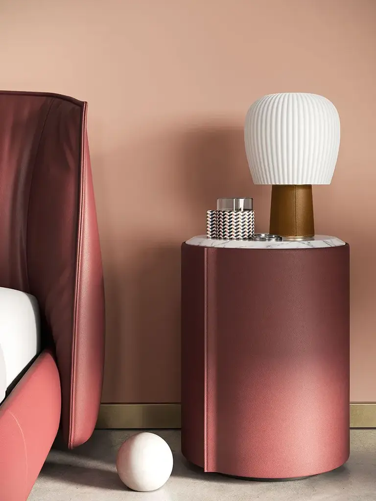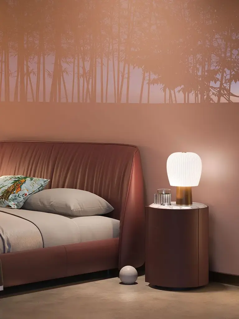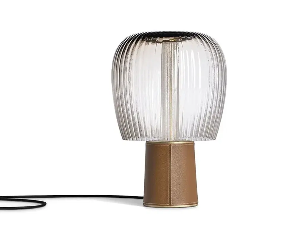 The Nymph family of table lamps designed by Sebastian Herkner is inspired by the namesake female deities of Greek mythology: personifications of nature at the service of humans. Based on the notion of a gentle presence accompanying people’s daily lives, comes a blown glass lamp featuring a finely pleated shade, seemingly floating weightlessly atop the leather-covered base. A button set into the lampshade is an ode to the classic leather “button” characteristic of Poltrona Frau upholstery. When lit, the light transforms into a graceful light sculpture of sorts. The Nymph lampshade is a one-off piece made of blown glass with ribbed workmanship, available in various finishes. The light fixture is made of a cylindrical tube housing a LED module in its base. The textured surface of the cylinder lends the light a distinctive visual effect. The base, with its tapered silhouette, is upholstered in Pelle Frau® ColorSphere in a selection of colors, featuring contrast stitching and brass metal details. The lamp is available in a small or medium size.A bronze touch button is used to turn it on and off, while a modulating dimmer function is used to control the light and adjust its intensity. USB charging, 18W 3000K LED board and 25W power.