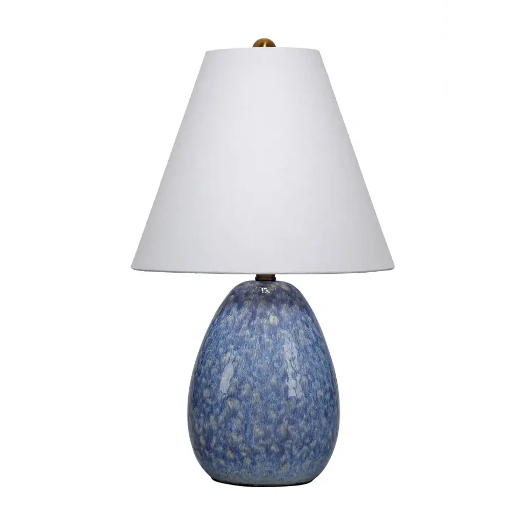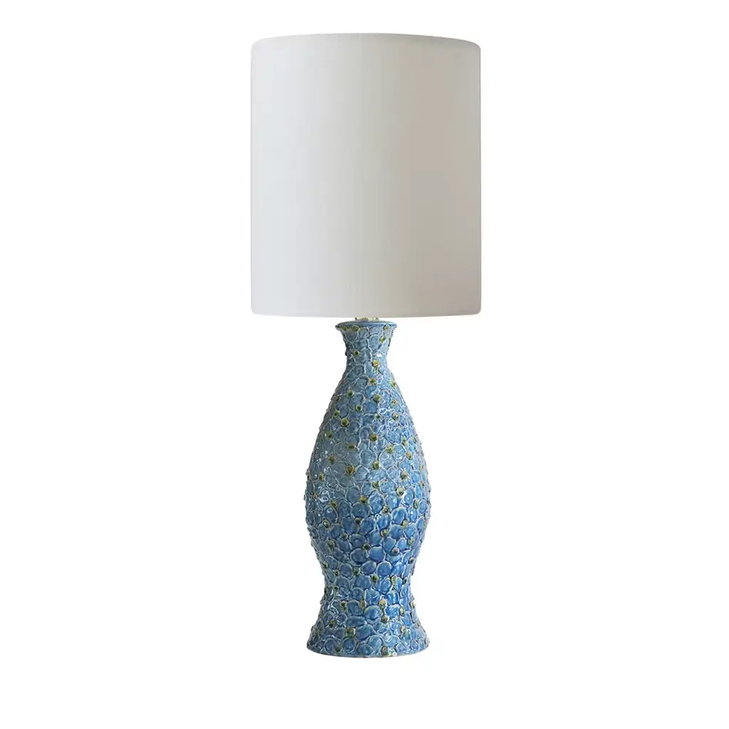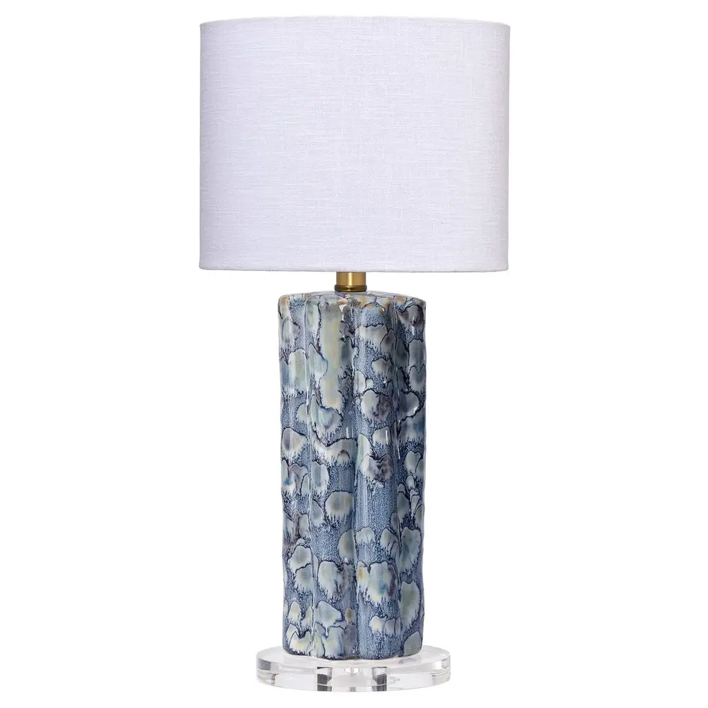 This ceramic lamp features soothing shades of blue and green, blending together like ocean tides. Its surface is adorned with scalloped protrusions reminiscent of gentle waves, adding texture and movement to the design. A clear base provides a modern, airy contrast, grounding the piece while keeping the focus on its unique and beautiful form.
