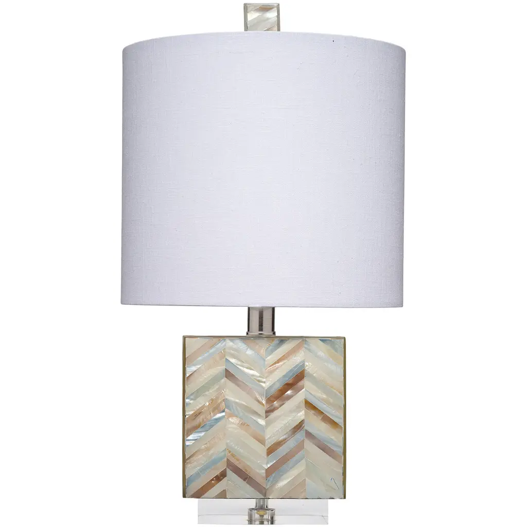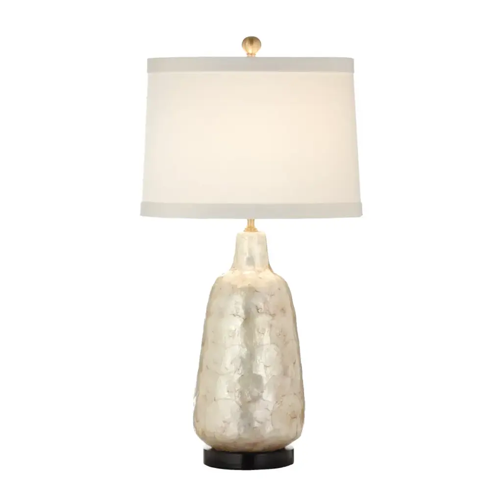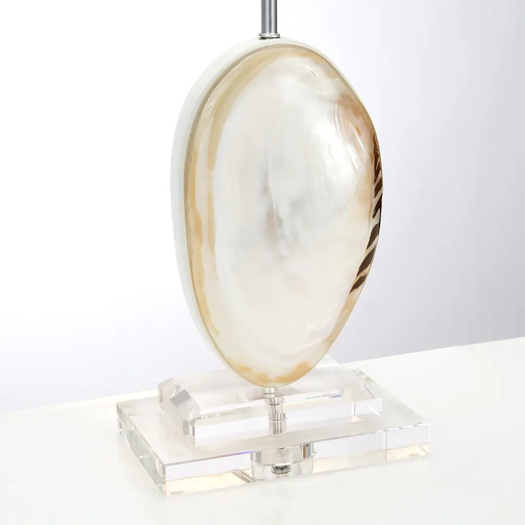 So realistic you can hear the sound of the waves....a natural mother of pearl shell [each one will vary in size, shape and color] mounted on a nickel metal pole, on simple rectangular steps of optic crystal. Topped with a white linen hardback shade, in a rectangular rounded corner shape. Sculptural illumination for any home...naturally. This contemporary table lamp has an ornate design, with an optic crystal base, and a white linen hardback shade. 14.5/9" x 14.5/9" x 9"H Rectangle Rounded Corner Hardback Shade in White Linen 100 Watt Free shipping in the U.S. Finish Name/Color Natural Mother of Pearl Product Weight - lbs 9.04 Width/Diameter ALL INCHES Base = 8" Height base to shade btm 15.5" Depth Base = 5" overall height 25.5" Voltage 120 Cord Length 72" Cord Color Clear Silver Wattage 100w Bulb Type 3-way Number of Bulbs 1 Bulb included? NO Dimmable? NO Dupioni Silk, Paper, Metal, Etc. 14.5/9" x 14.5/9" x 9"H Rect. Rounded Corner Hardback Shade in White Linen Shade Length 14.5 Shade Height 9 Shade Depth 9 Shade Material Linen Shade Color White Shipping Lead Time for In-stock Goods 3 business days