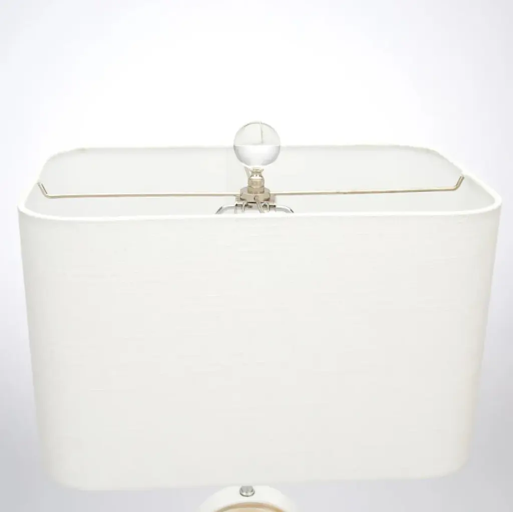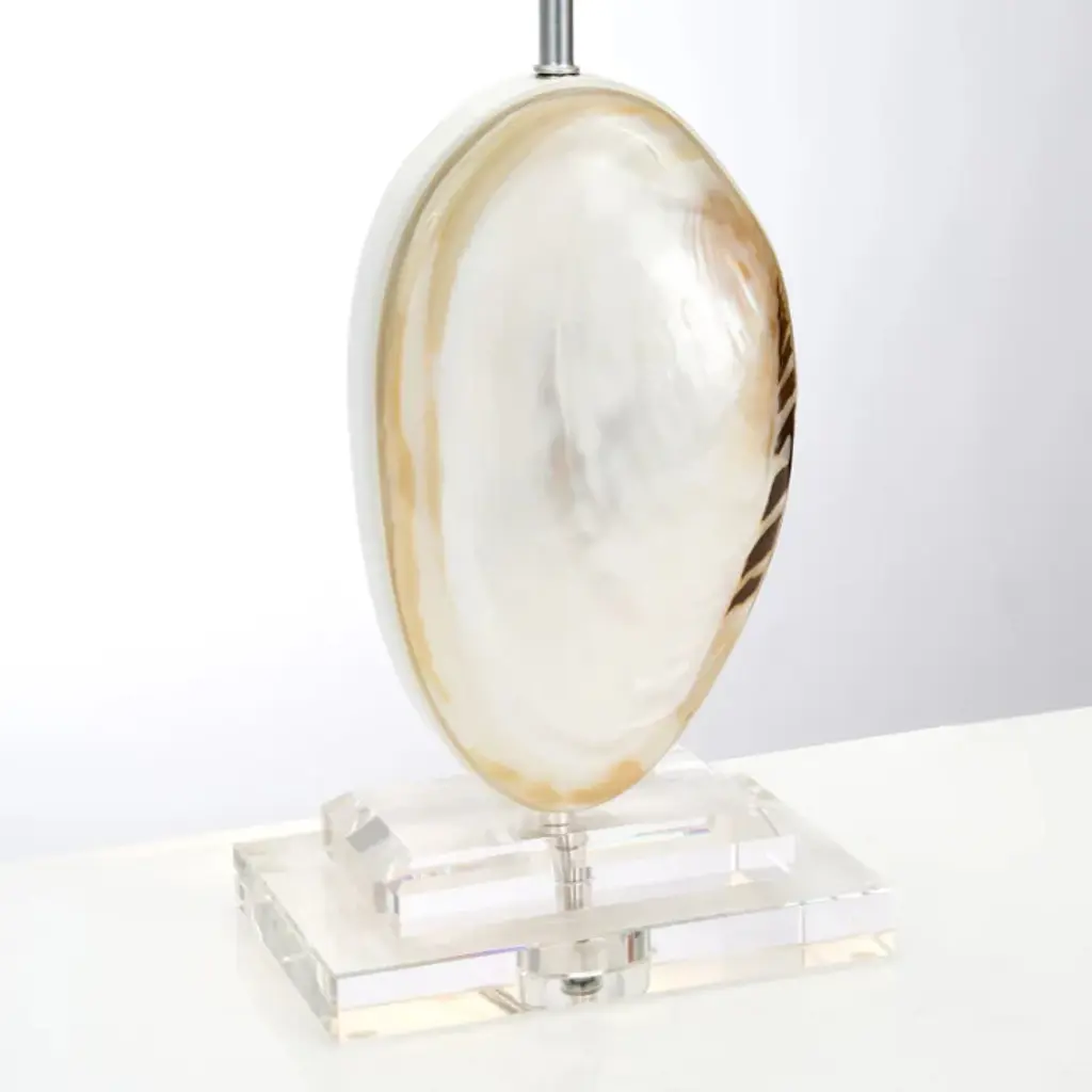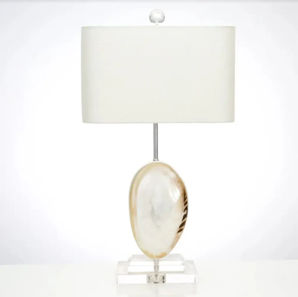 So realistic you can hear the sound of the waves....a natural mother of pearl shell [each one will vary in size, shape and color] mounted on a nickel metal pole, on simple rectangular steps of optic crystal. Topped with a white linen hardback shade, in a rectangular rounded corner shape. Sculptural illumination for any home...naturally.• • • Due to the natural elements of the mother of pearl, the shape, size and color will vary from piece to piece - enhancing the natual beauty of the finished piece.• • • Additional Details: Dupioni Silk, Paper, Metal, Etc.:14.5/9 x 14.5/9 x 9"H Rect. Rd. Corner Hardback in white linenUL, ADA, CUL, CSA:UL + CULLighting Details:Voltage:120Pack:1Wattage:100wType:3-way