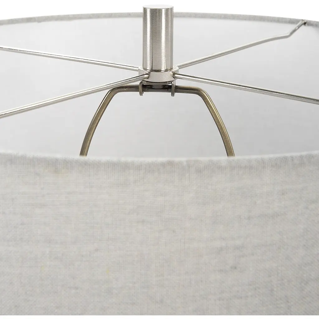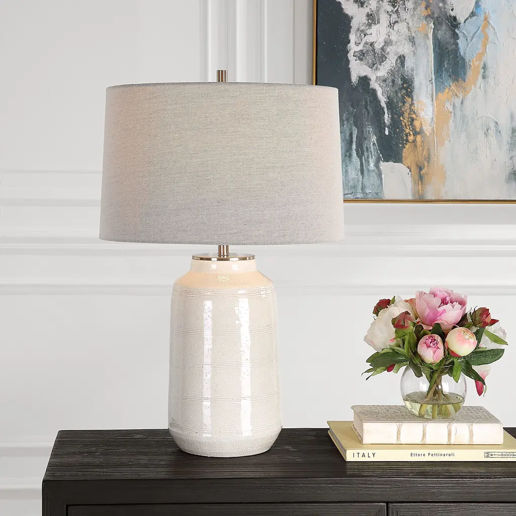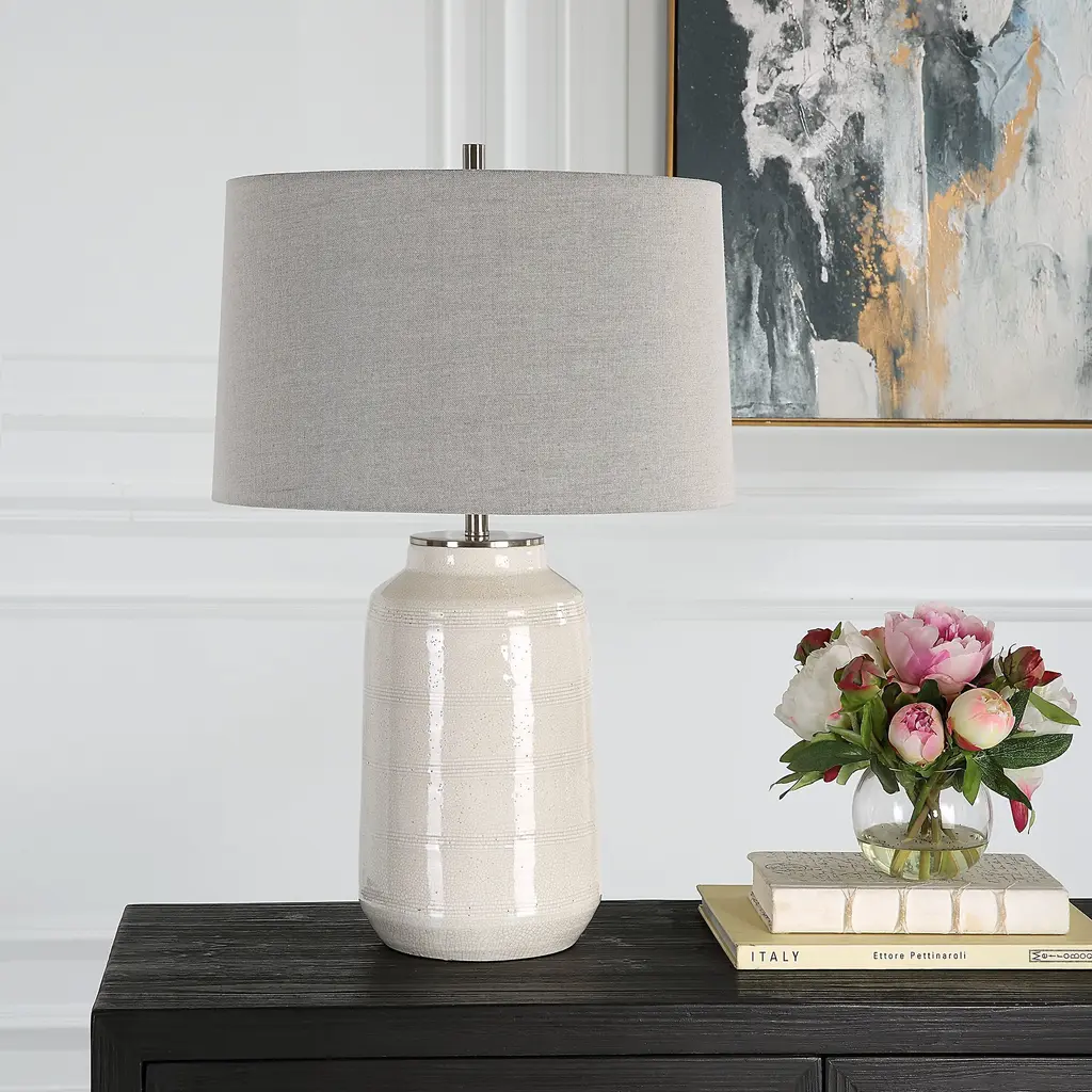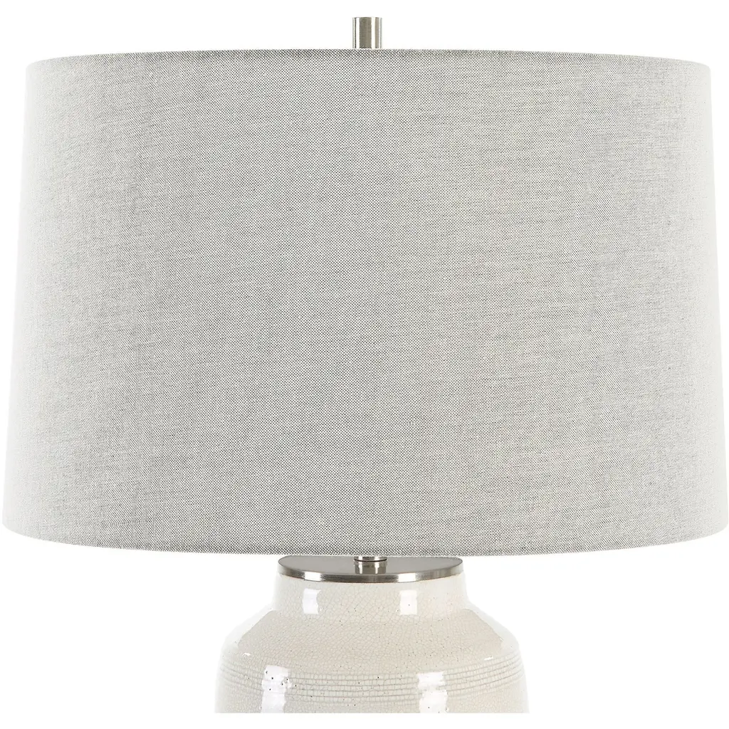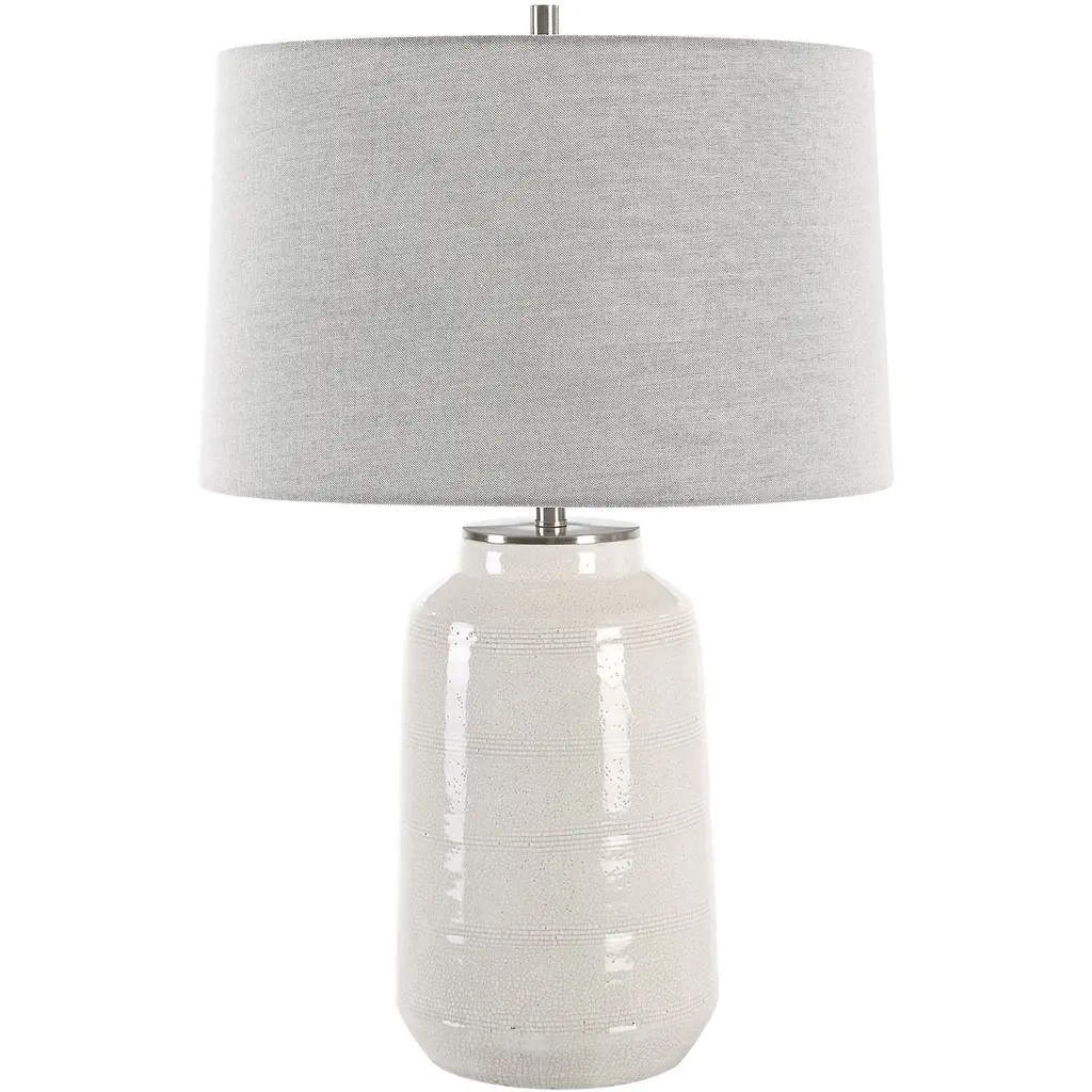 This Farmhouse Inspired Ceramic Table Lamp Features An Off-white Crackle Glaze With Subtle Horizontal Striped Detailing, Paired With Plated Brushed Nickel Accents. A Slightly Tapered Round Hardback Shade In Light Gray Linen Fabric Completes The Piece. Due To The Nature Of Fired Glazes On Ceramic Lamps, Finishes Will Vary Slightly.
