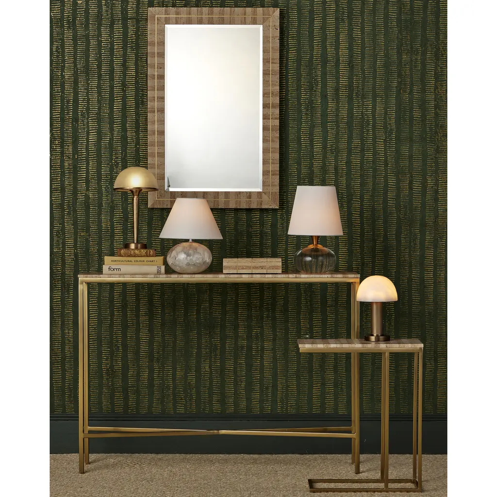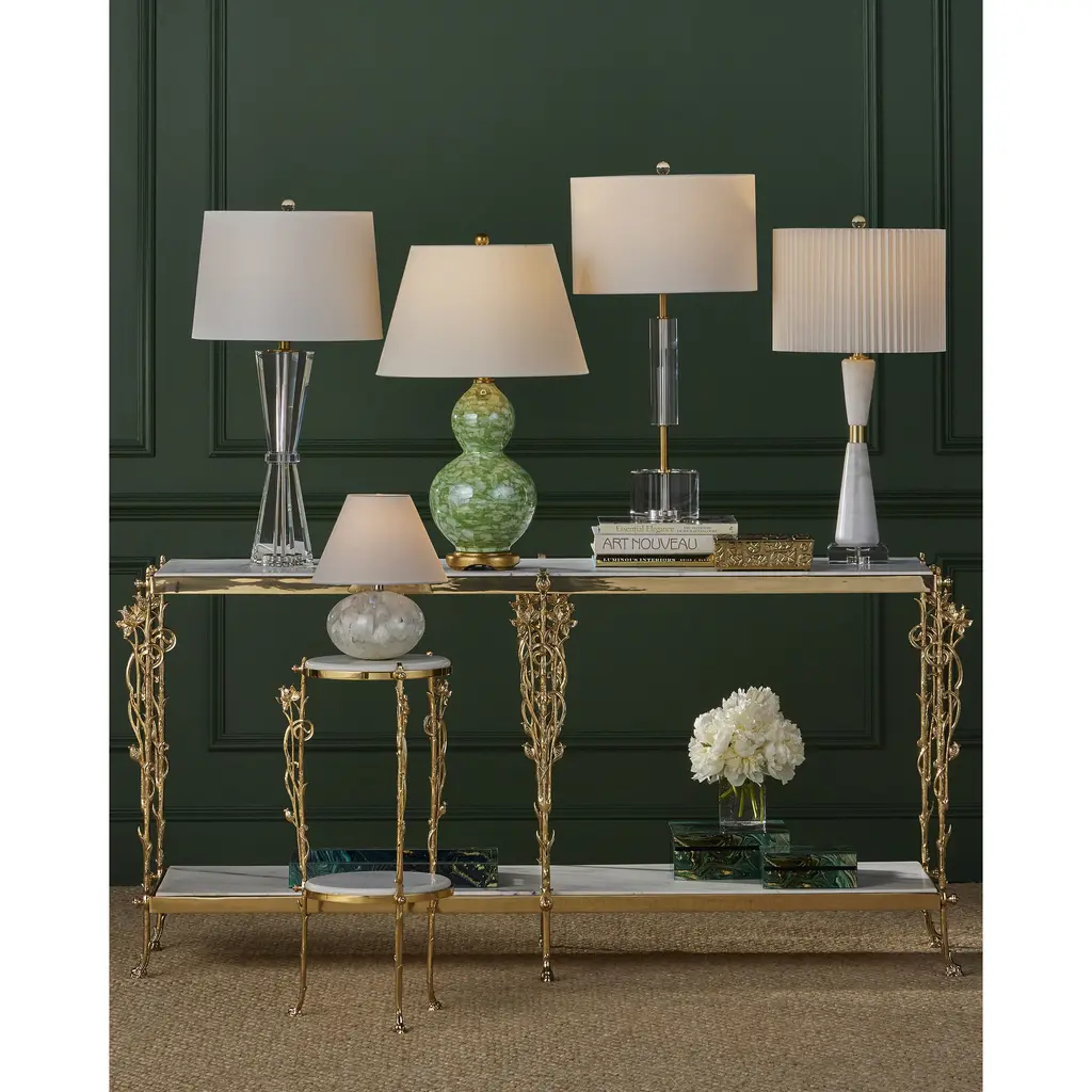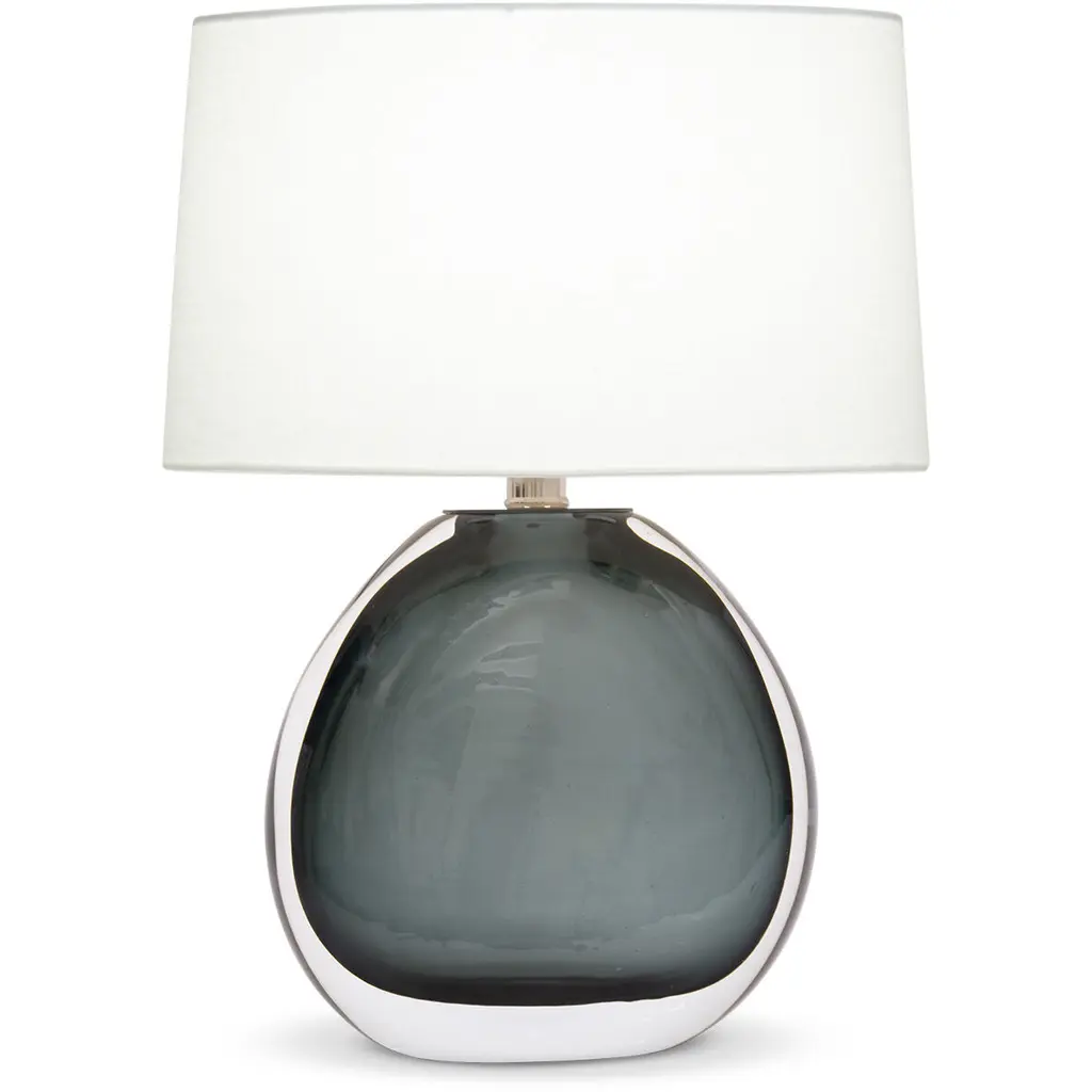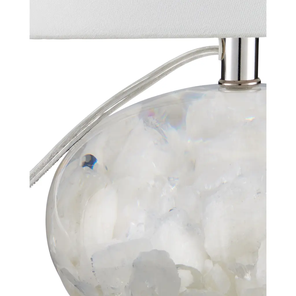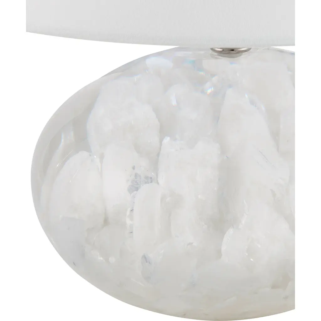 The blossoming cloud-like formations contained in the orb-shaped body of the Odette White Table Lamp were formed when quartz was encased in clear composite. Contributing to the brightness of this design is the polished nickel hardware that rises to disappear under the clean-lined shade. Because this is an artisanal piece, no two of the Odette lamps will be exactly alike.