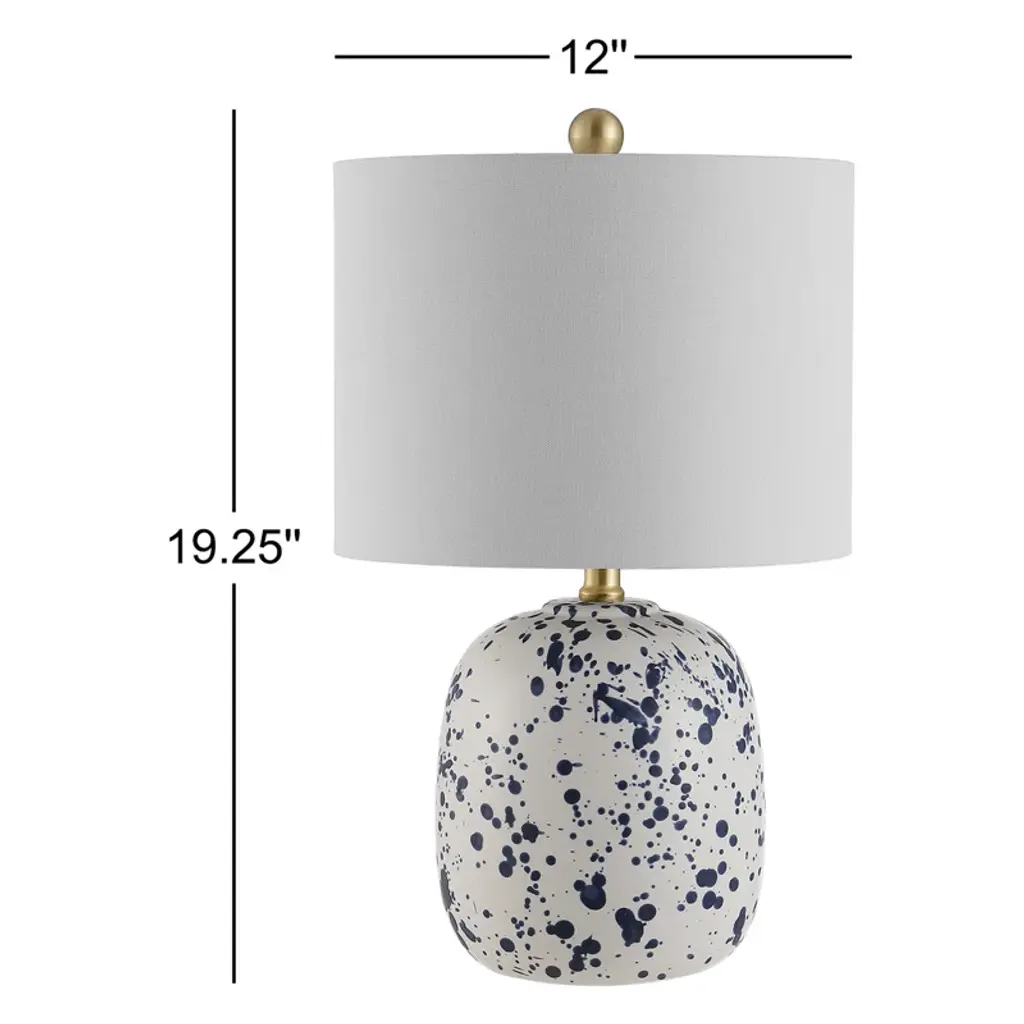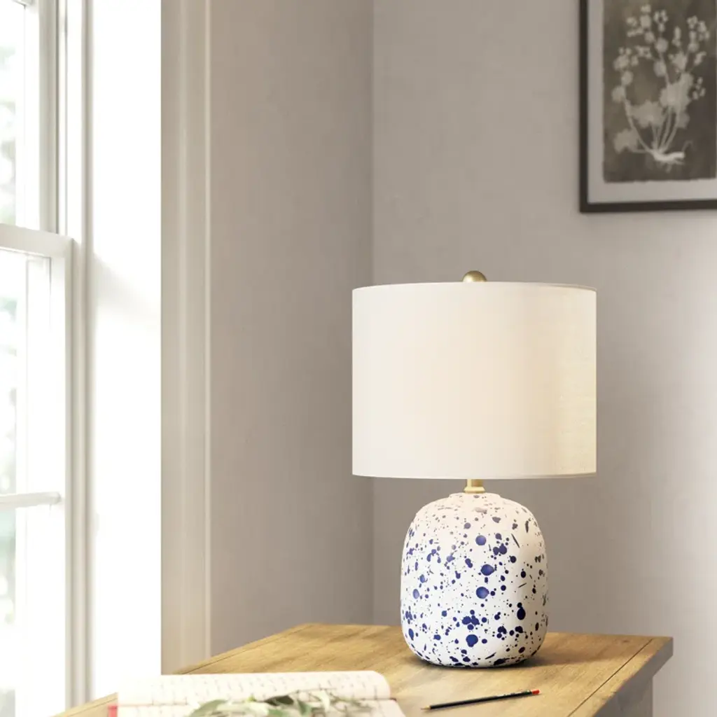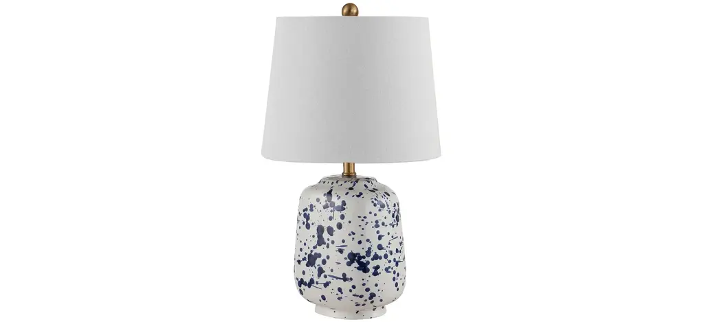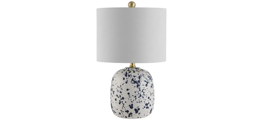 This table lamp takes the artist’s brush to sculpted ivory and navy ceramic, making a masterpiece in mixed media for today’s décor. Illustrated trees give a rich, natural touch to the soft glow beneath its white drum shade.