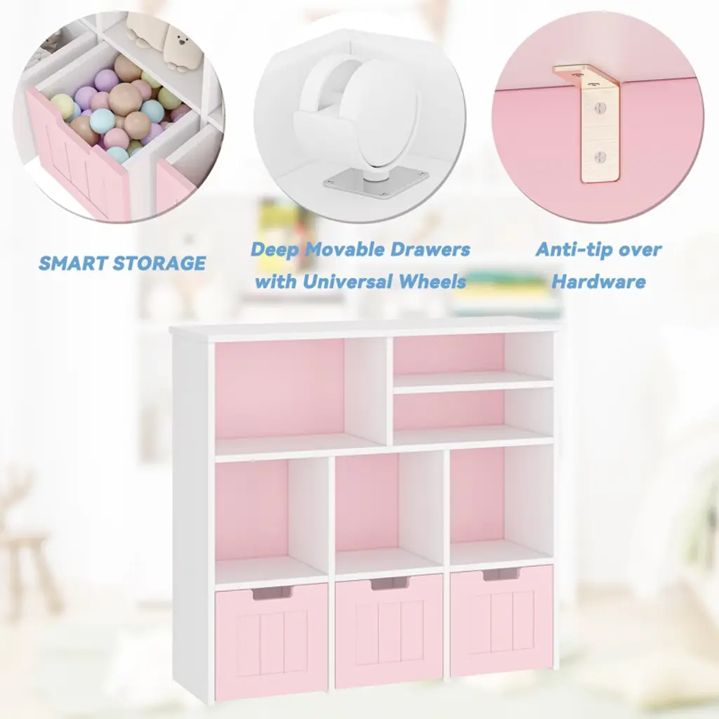Odk Kids Bookcase Toy Storage Organizer Toy Chest With 3 Movable Drawers & Hidden Wheels Toy Storage Cabinet For Bedroom, Playroom, Nursery, Pink