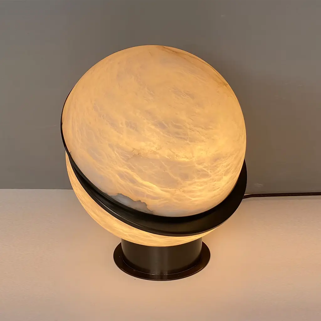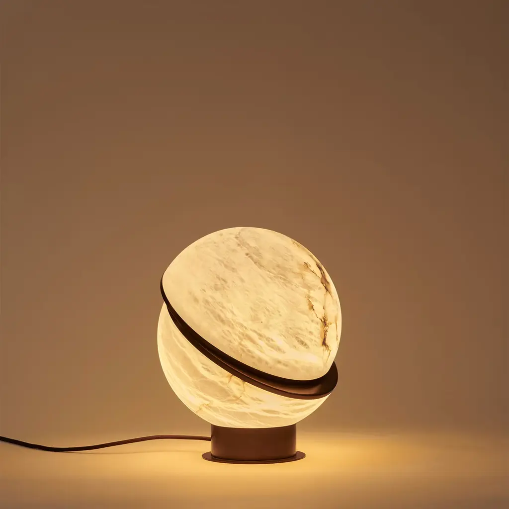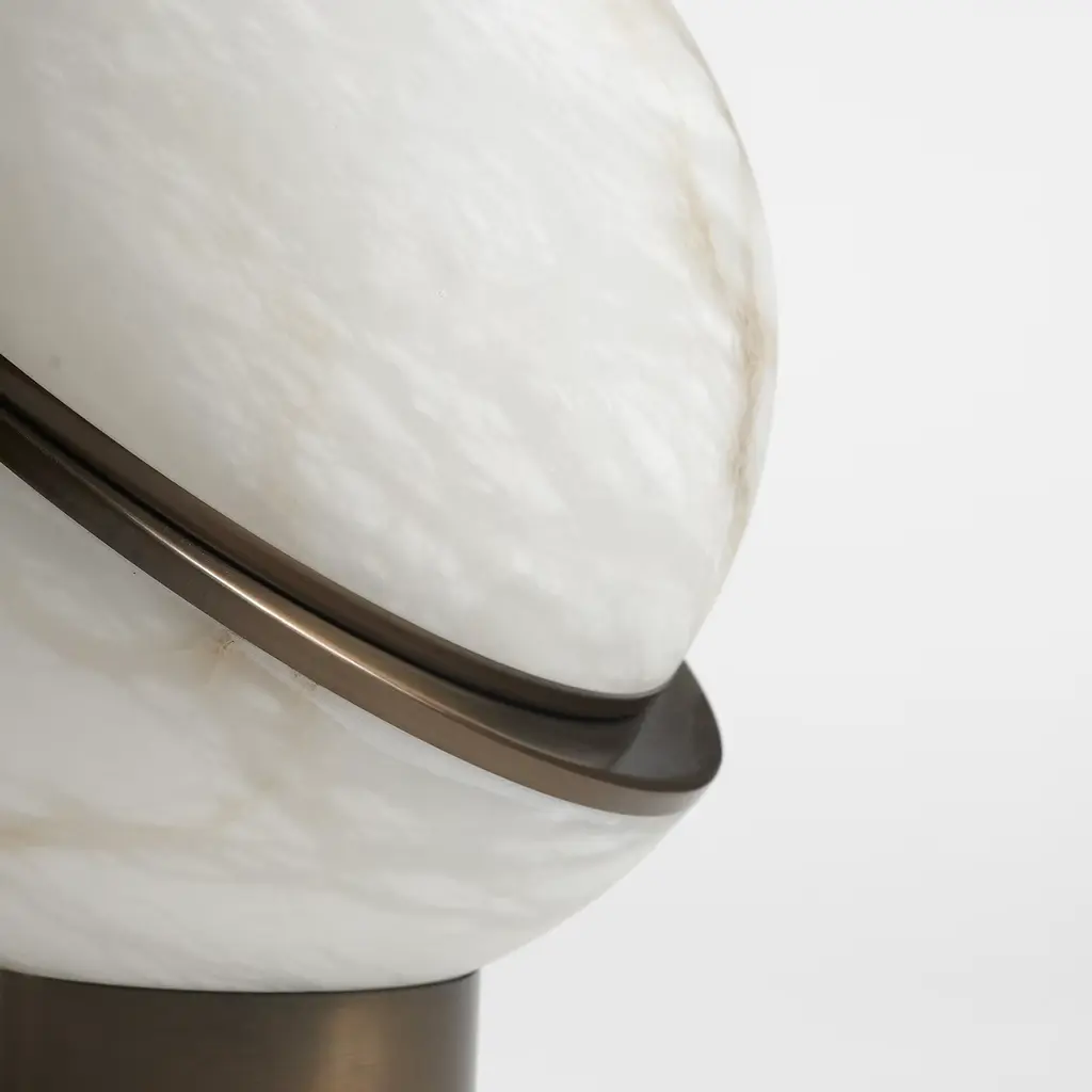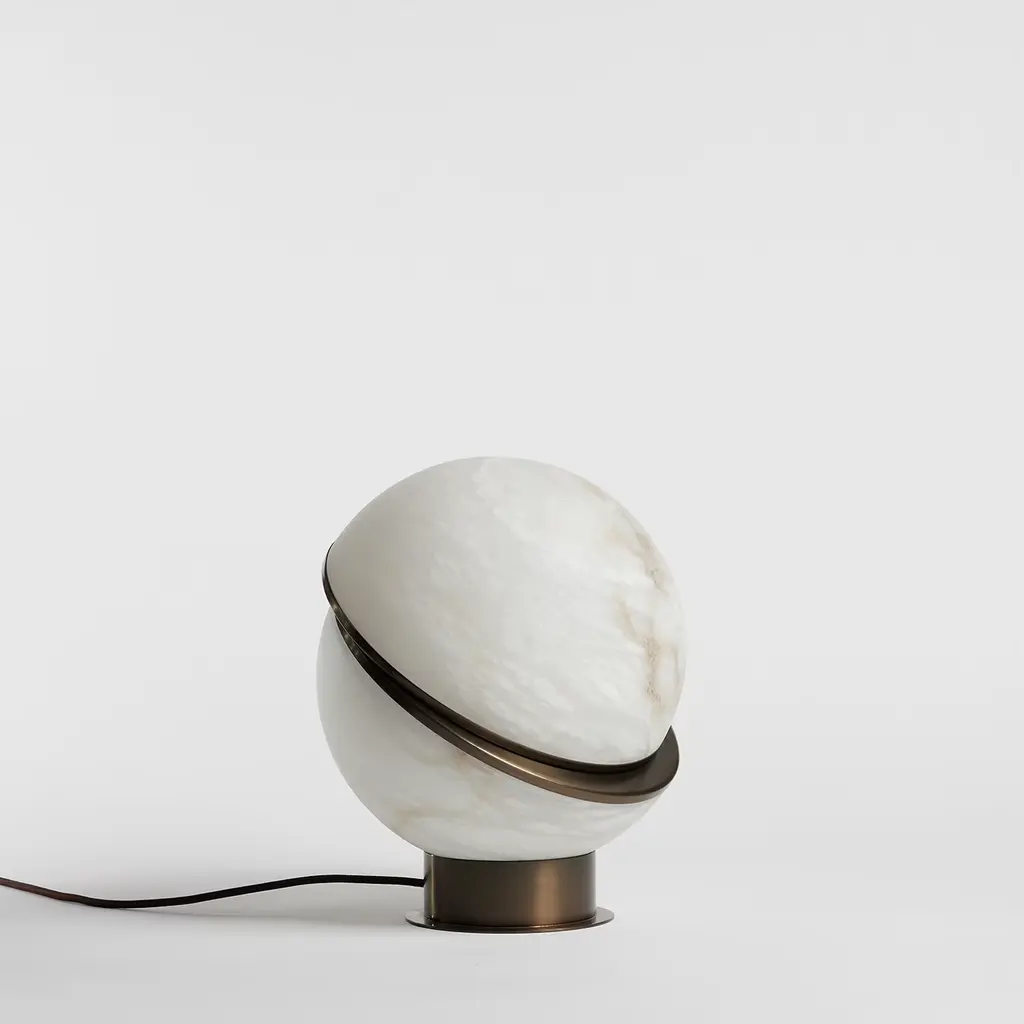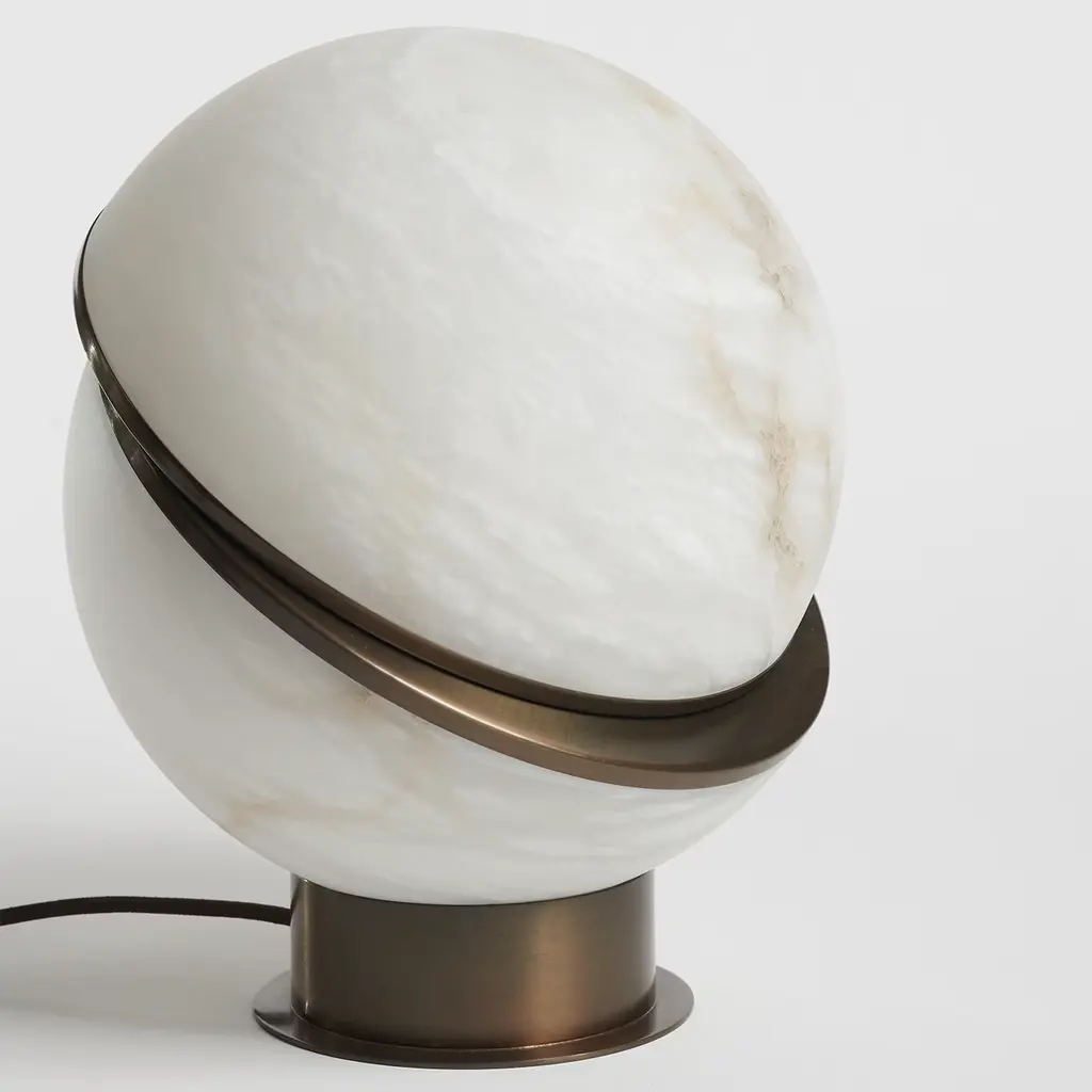The Alabaster Globe is a table lamp composed of two half spheres in alabaster held together by a thin brass contour. Combining the ethereal allure of alabaster stone and the warm reflection of brass, this lamp is a stunning complement to a refined interior.