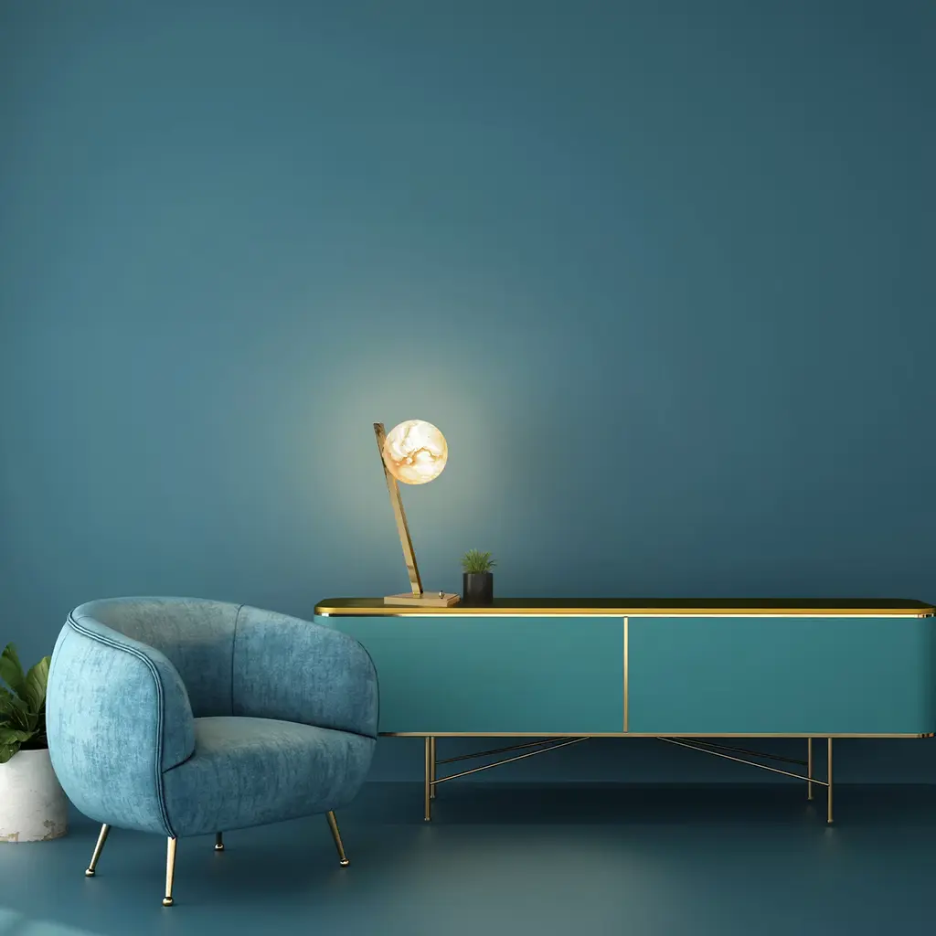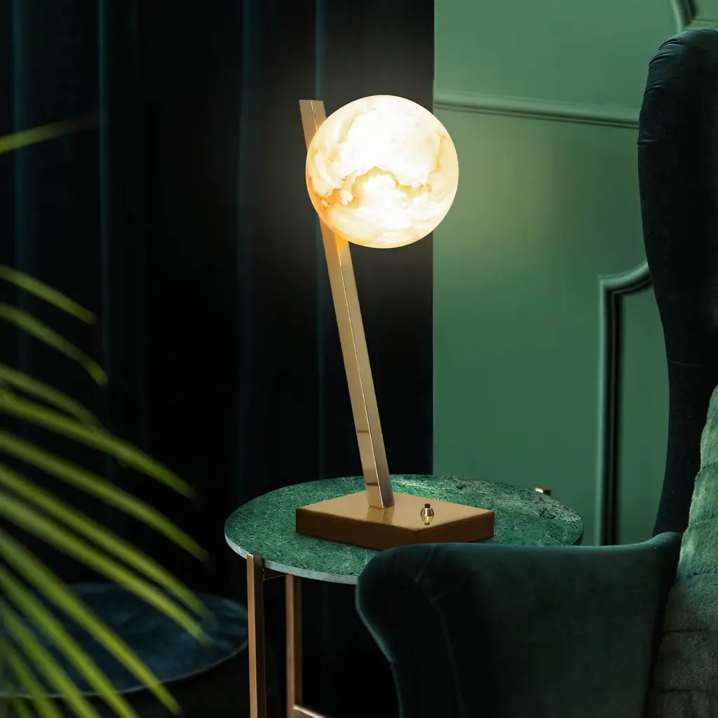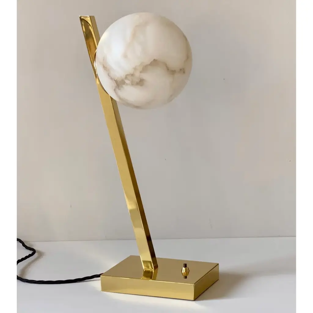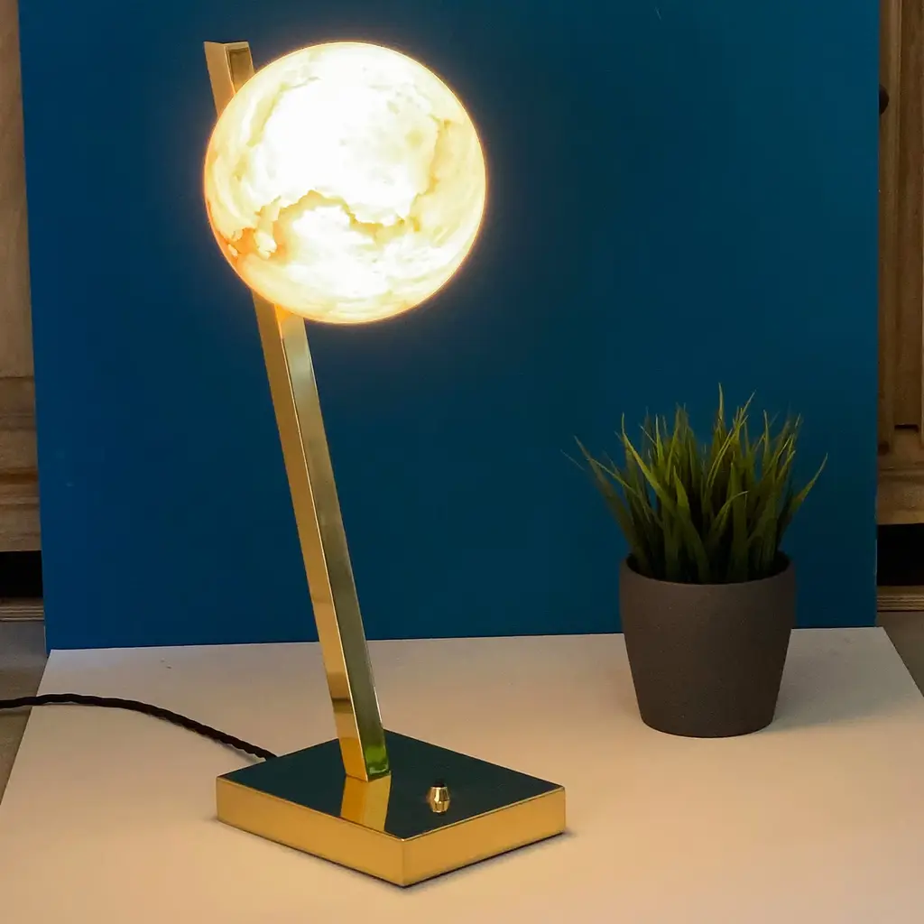 A precious table lamp, where the magic of the backlighted veined alabaster is dominant. A strong remind to the full moon in the mid summer nights. The brass base and the offset stem create a play of equilibrium, giving harmony to the object.
