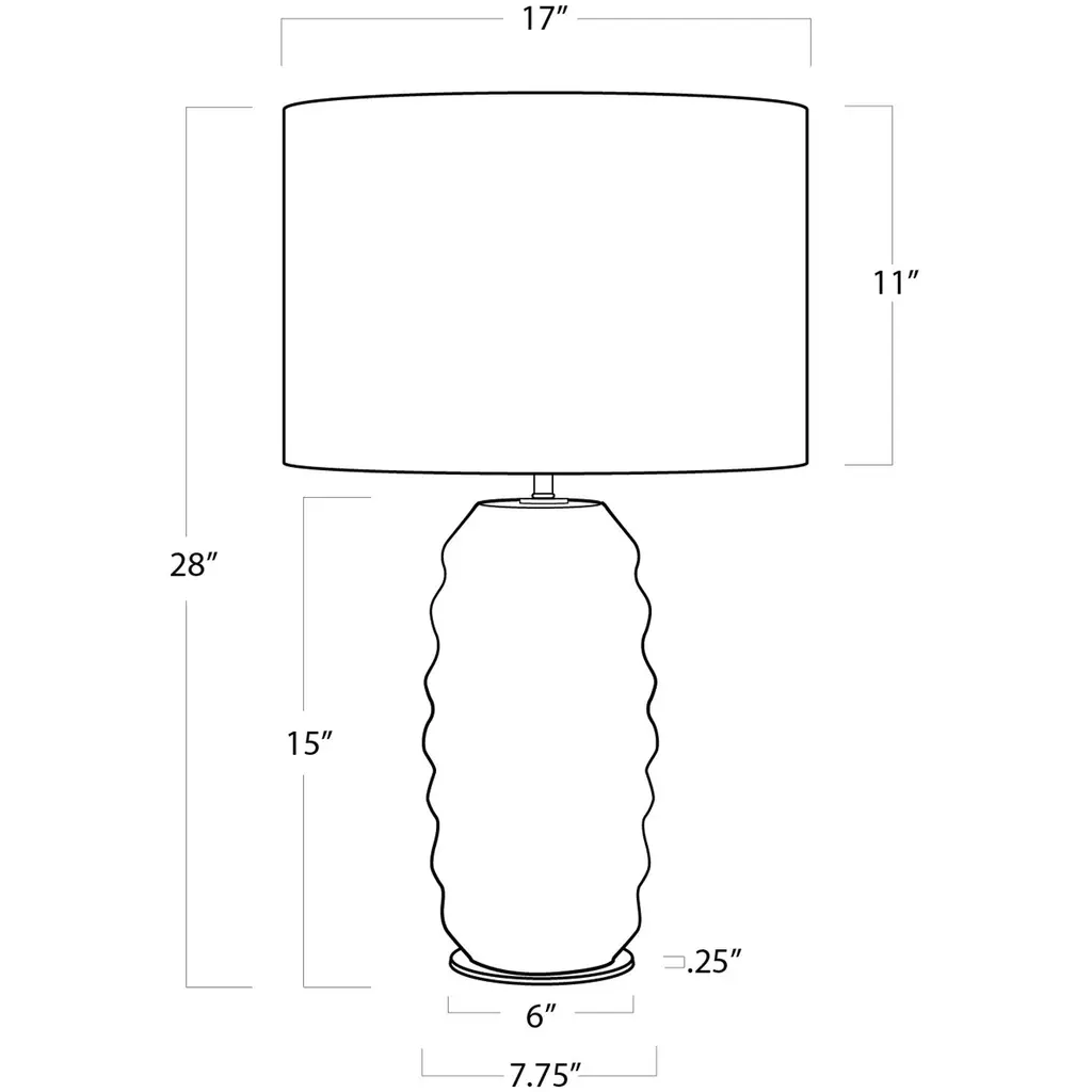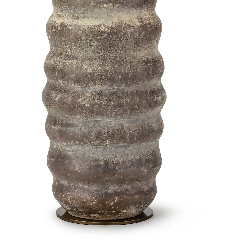 The Ola has been expertly crafted by artisan's hands to achieve the natural, organic look of true earthenware. Finished with a hand-applied, matte glaze, various shades of earthen brown and tan are displayed. The coloring and distressing are further enhanced by the natural, repeating curves that make up the lamp's body. Finished with an aged brass metal disc at the base and drum shade in natural linen at the top, the Ola is the perfect lamp to add to a space that welcomes the imperfect beauty of nature.