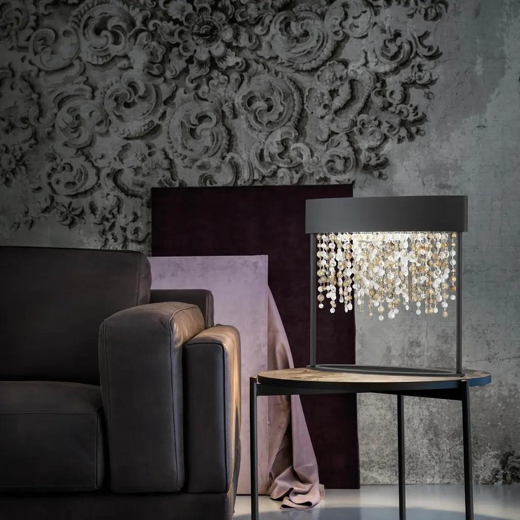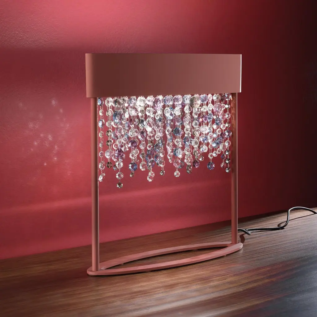 Bring jewel-like beauty to your space with the elegant Ola Table Lamp from Masiero. Its open-air powder-coated metal frame showcases cascading Italian glass gems, available in four finishes. Each finish boasts a unique colored gem assortment, while the specific colored power cord adds a coordinating touch. With an inline on/off switch, Ola offers both style and convenience. Highlights