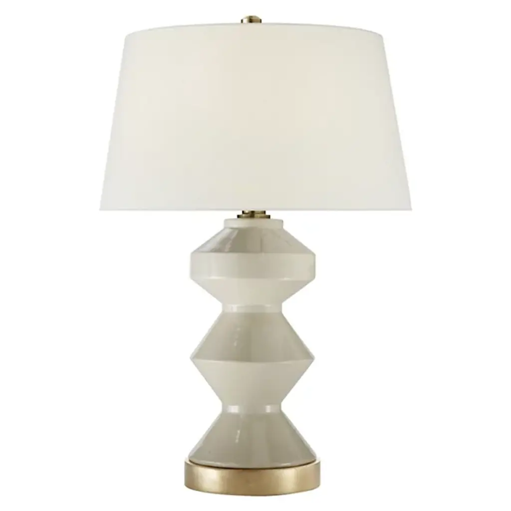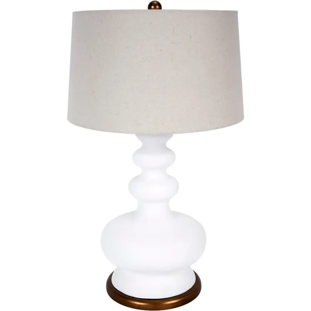 This gorgeous Arya lamp by Old World Designs features a glass base in white or emerald green with a white linen shade.