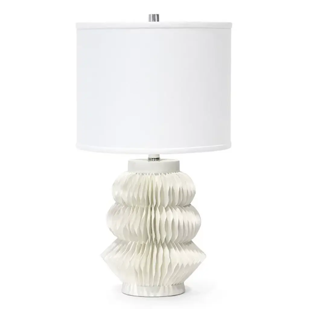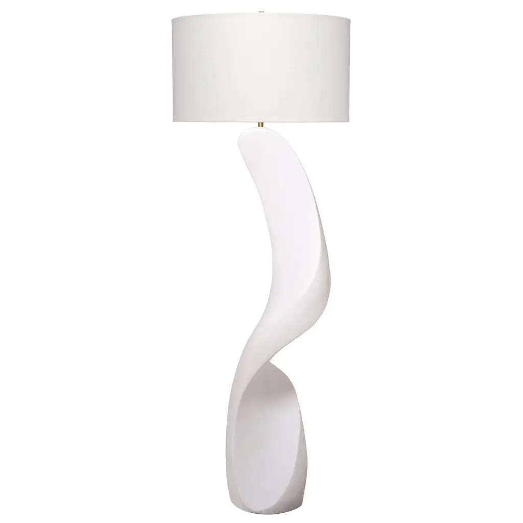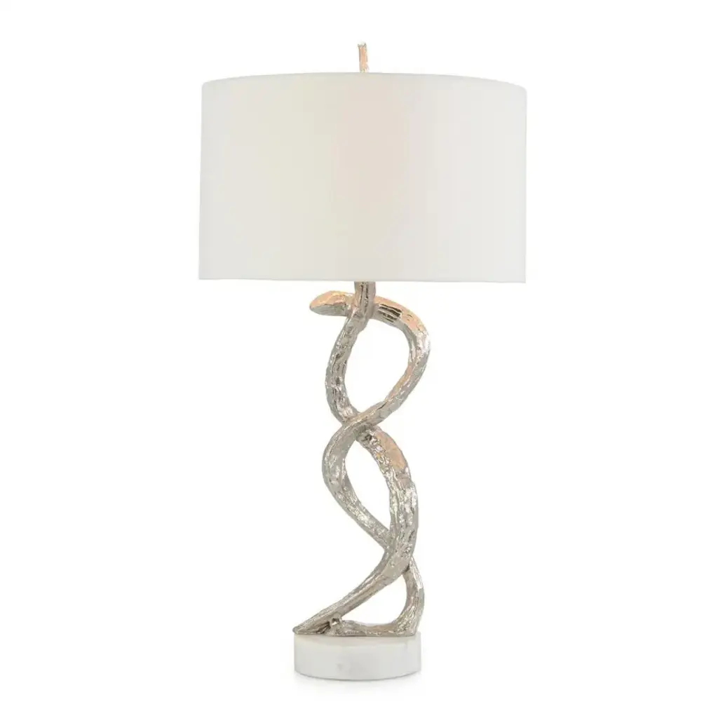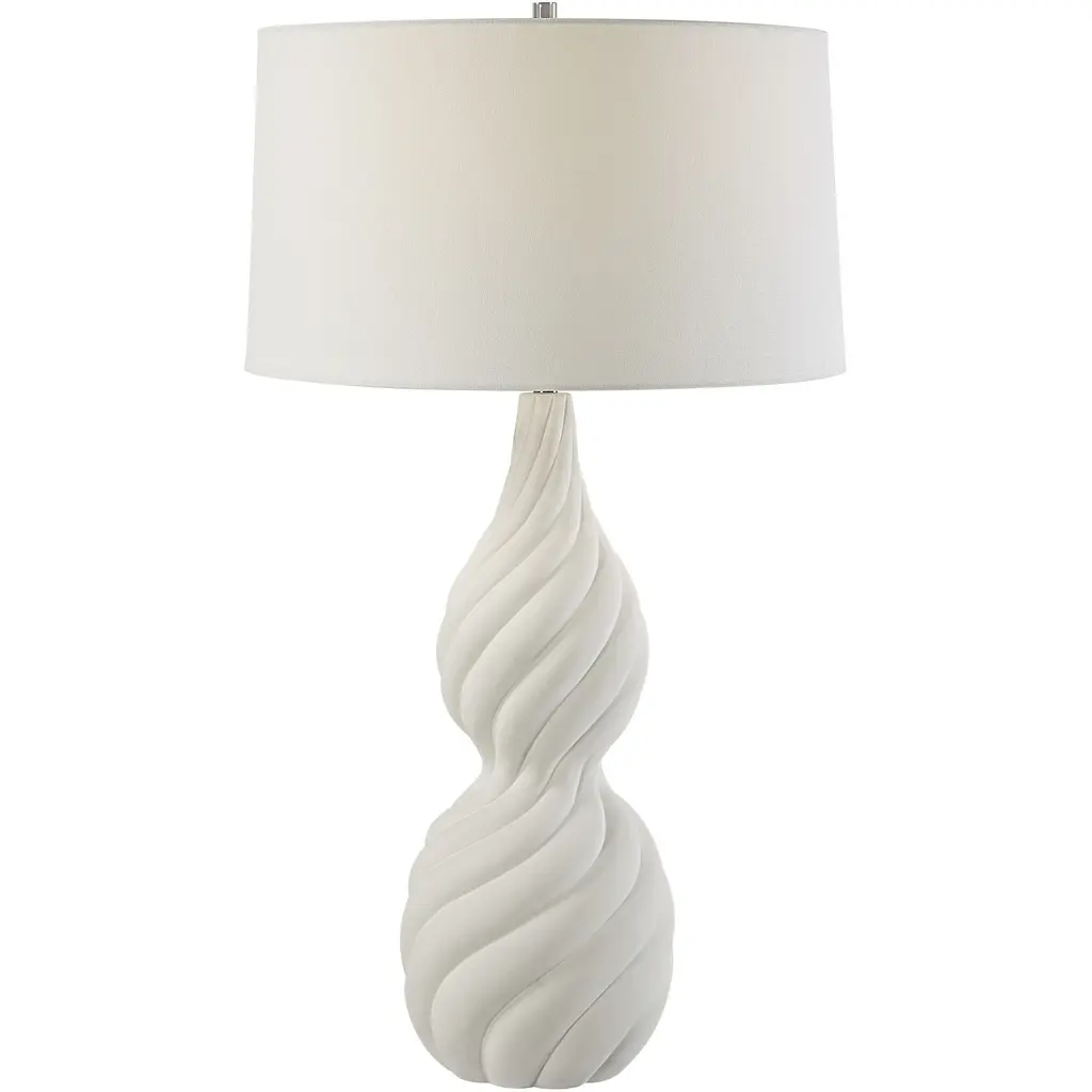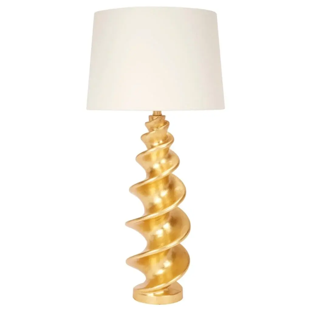 This gorgeous lamp with its natural linen shade features a gold leaf or white gesso finish.