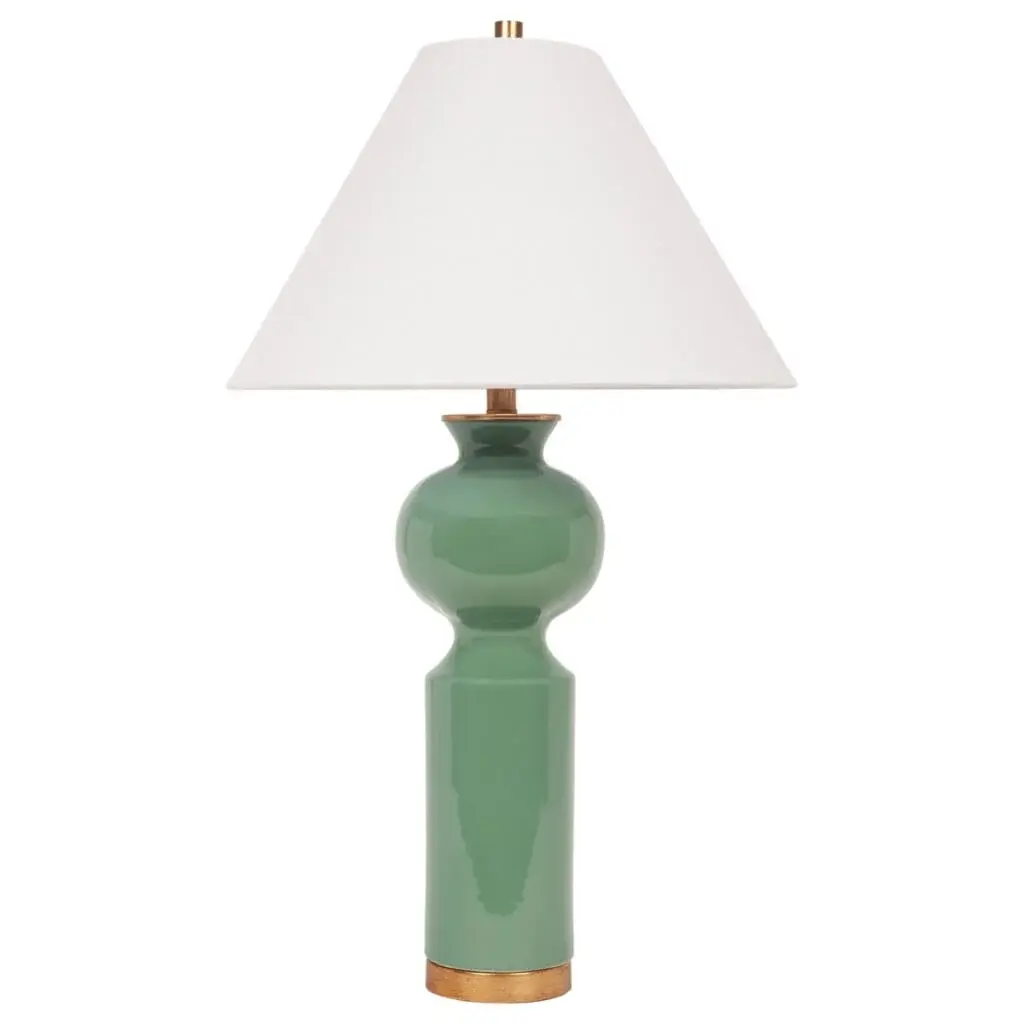 This gorgeous lamp with its white linen shade features a ceramic base in a beautiful shade of Parisian blue or green.