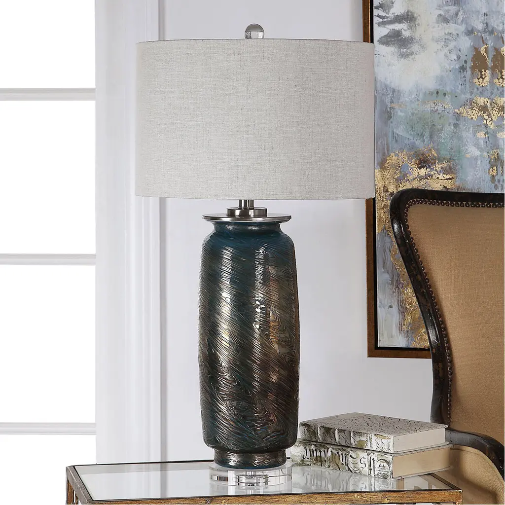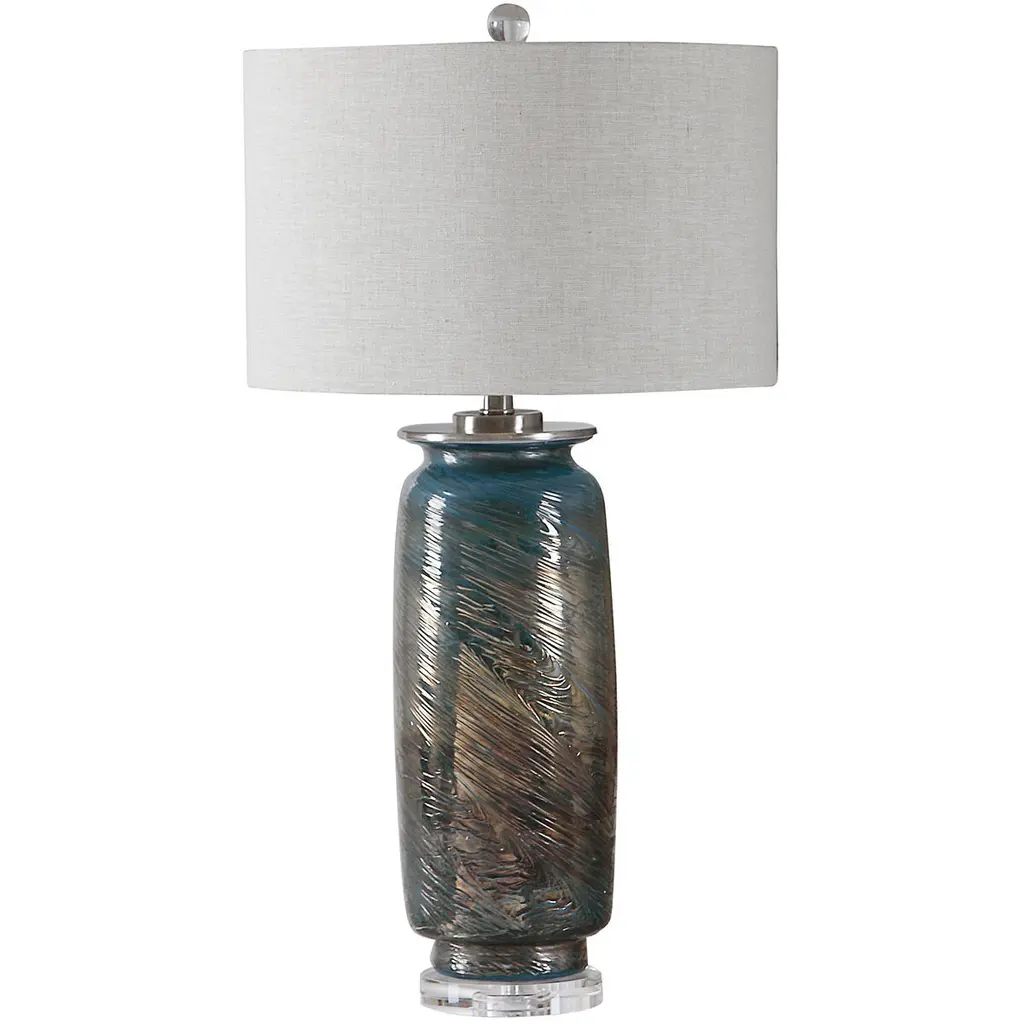 This Table Lamp Features A Decorative Glass Base That Showcases A Unique Swirl Texture, Highlighting Shades Of Ocean Blues, Greens And Metallic Bronze. Accenting These Vibrant Colors Are Brushed Nickel Plated Details And A Thick Crystal Foot. The Round Hardback Drum Shade Is A Light Beige Linen Fabric With Natural Slubbing.