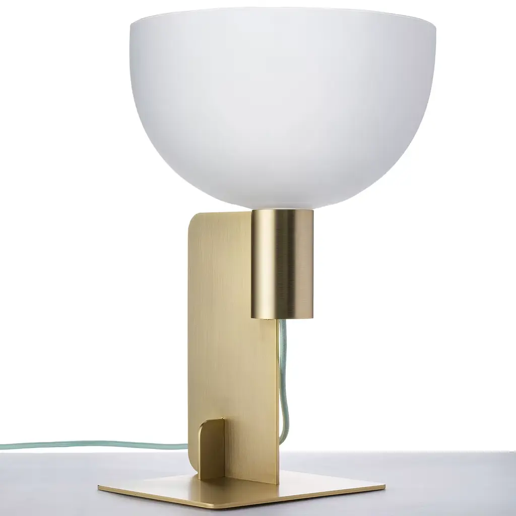 Discover the lamp "Olimpia" by Zaven which is a 3D collage, made of a structure of metallic sheets and a cup of borosilicate opaque glass. An asymmetric table lamp port of a limited edition, that rises like a stairway and pushes up the light.
