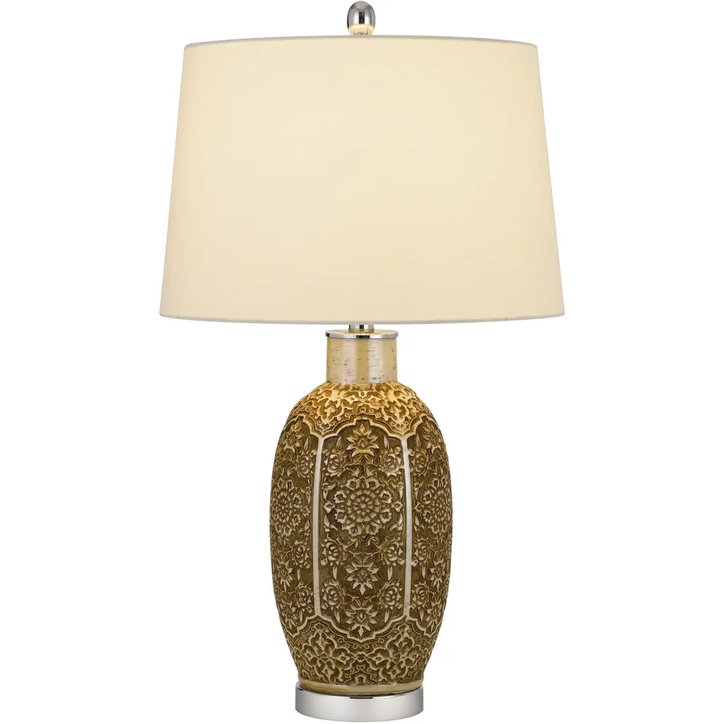Update your décor with this retro style ceramic table lamp. It features a classic oval silhouette, brown floral mosaic pattern and round brushed steel base. A round hardbac fabric shade and matching finial complete the look.