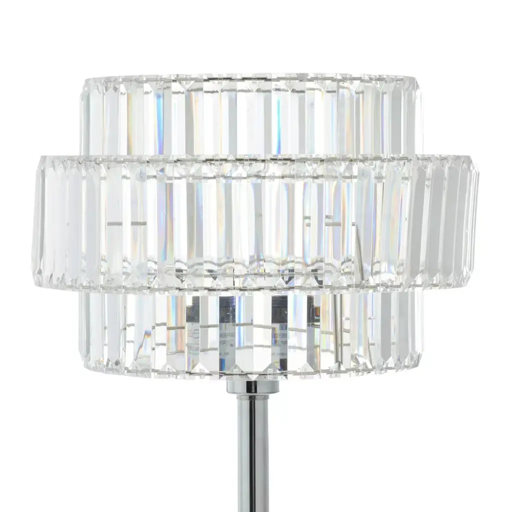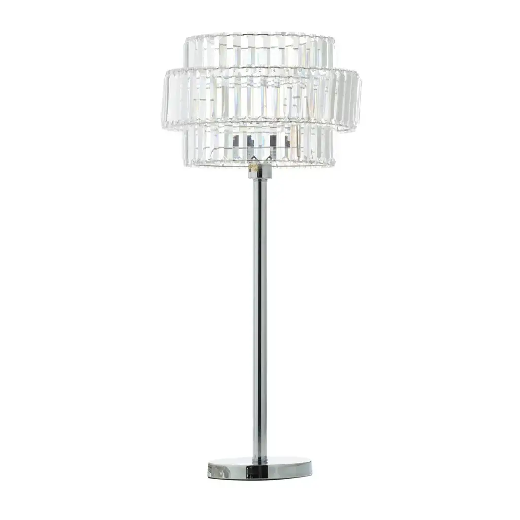 Illuminate your living room or bedroom with this acrylic glass table lamp and add a delicate and refined touch to your home corners. This eye catching lamp makes a playful addition to your surface space and beautifully illuminate its surrounding area. Make a statement with this unique lamp on mantle, console table or in any living space. Designed with black rubber stoppers at the base that prevent scratching as well as sliding around. Requires 1 Standard Type A bulb, not included. This item comes shipped in one carton. Molded acrylic glass is securely attached to iron frame. Suitable for indoor use only. Tiered and tapered drum shade encloses the lightbulb of this table lamp. Comes with an on/off switch. Contemporary design.
