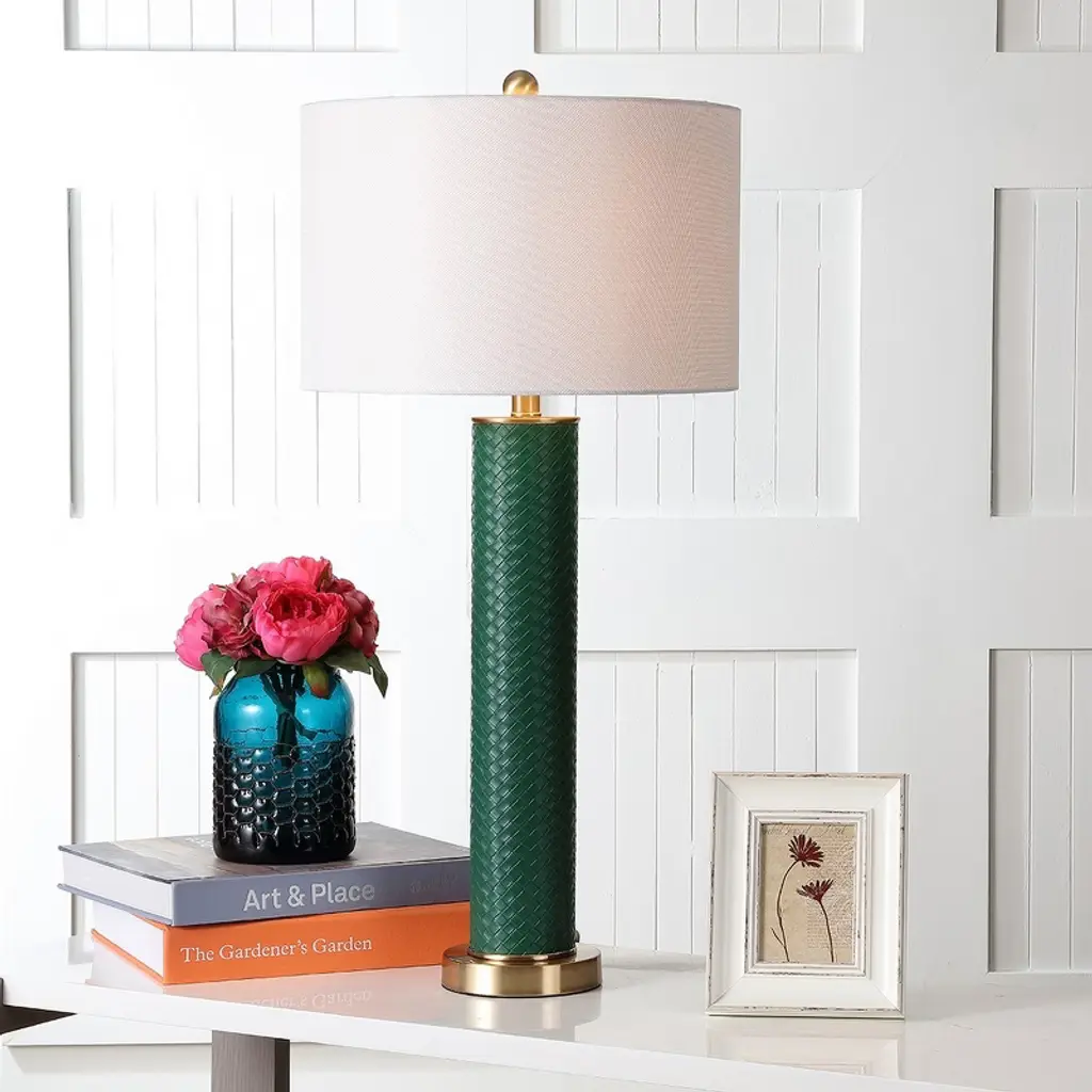 Illuminate your space with the stylish elegance of the Ollie Table Lamp in dark green woven finish. Crafted with a blend of pu and metal, this lamp brings a sophisticated touch to any decor. The rich dark green woven design adds a layer of texture that effortlessly complements your living room, bedroom, or office. The simplicity of its design provides a timeless feel that adapts to various interior themes. Whether you are looking to create a cozy reading nook or add a decorative element, the Ollie Table Lamp is versatile enough to meet your needs. Its sturdy construction ensures that it can be a staple in your home decor. Pair it with neutral tones for a classic look or bold accents to make a statement. Enhance your home with the charm and practicality of this unique lighting solution.