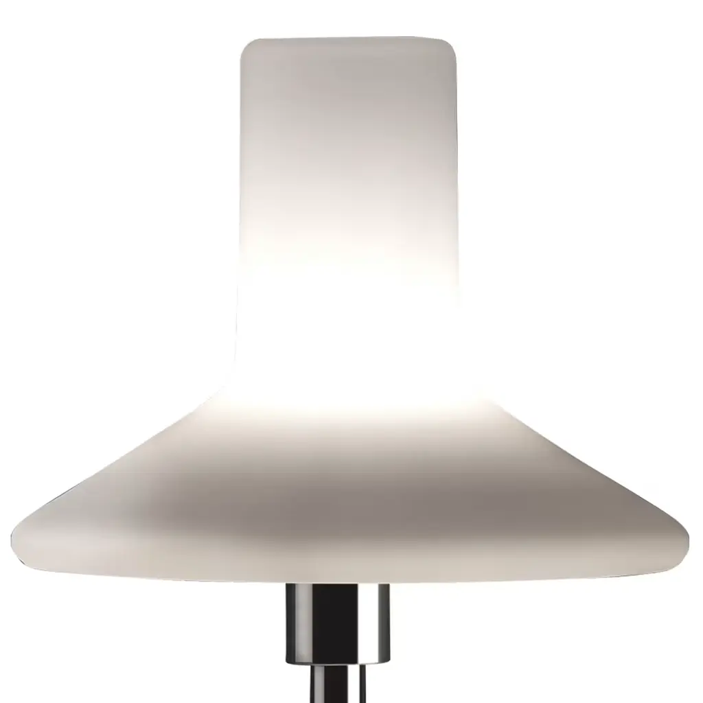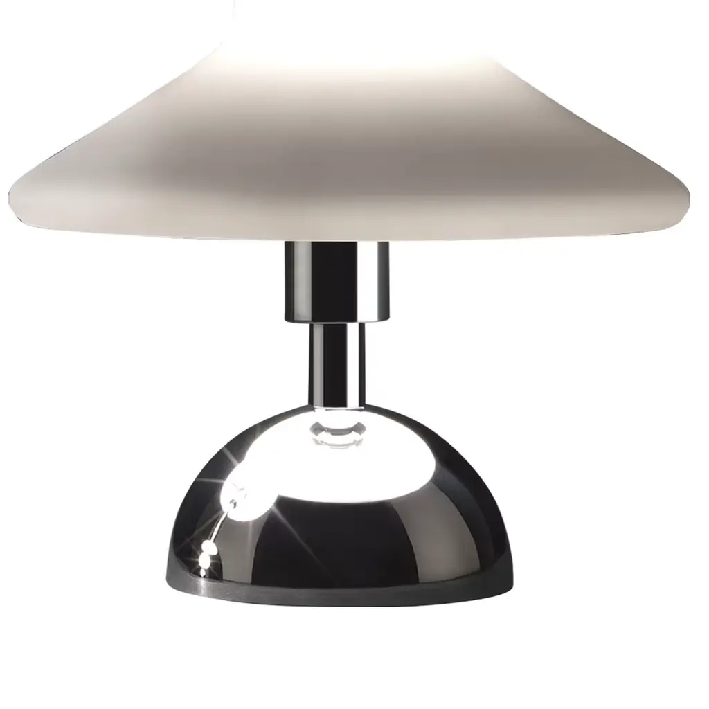 This striking table lamp features a chrome semi-spherical base and structure connected to a white glass shade with an interesting top hat shape.