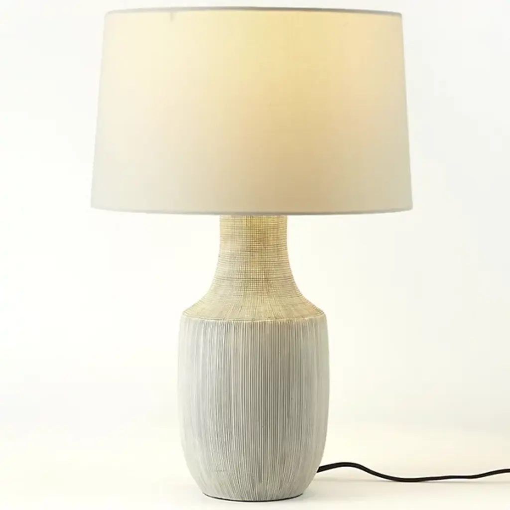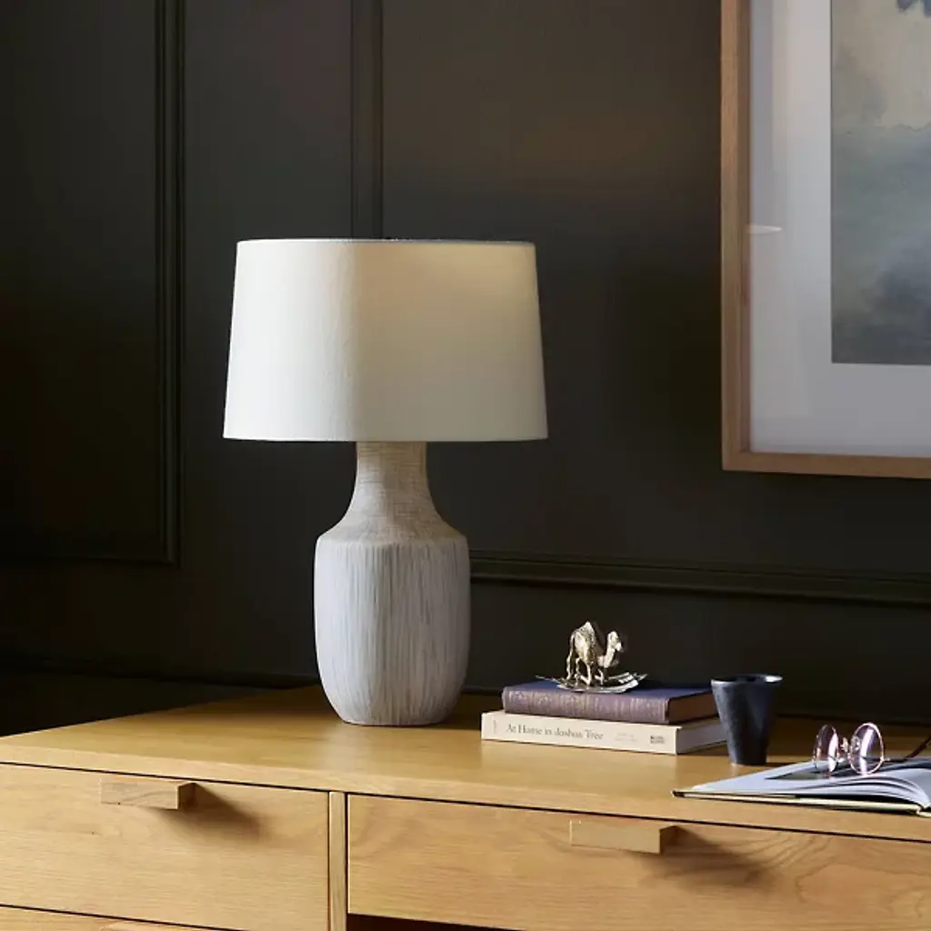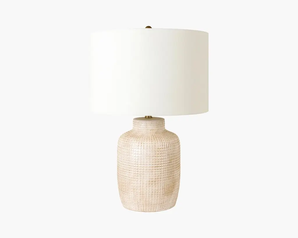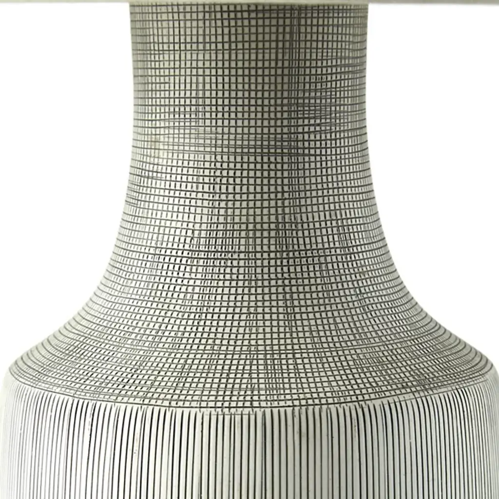 Give your living space a mid-century modern aesthetic with the Ombak Table Lamp by Four Hands. A subtle, checked design is hand-painted onto a gently rounded ceramic lamp base. This table lamp’s body neatly tapers to meet an ivory linen shade. A brilliant LED creates a pleasant glow, enhancing visibility.