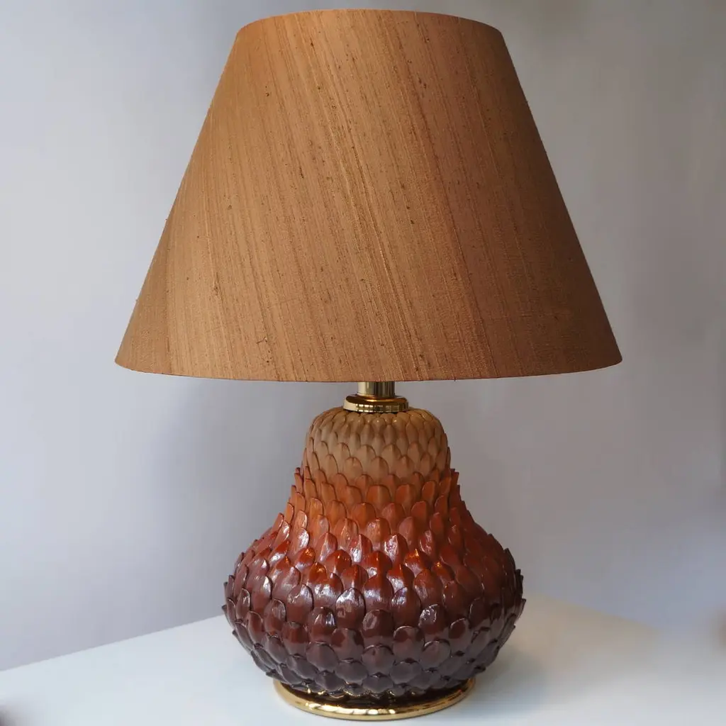 Two Italian brass table lamps with ceramic artichoke leaves. In the manner of Maison Charles. France, 1950s. Diameter ceramic base 39 cm.Height ceramic base 35 cm.Height of ceramic base with brass lamp holder 47 cm.Weight 8 kg.Shades shown are for demonstration purposes only.Please note that price is per item not for the set.
