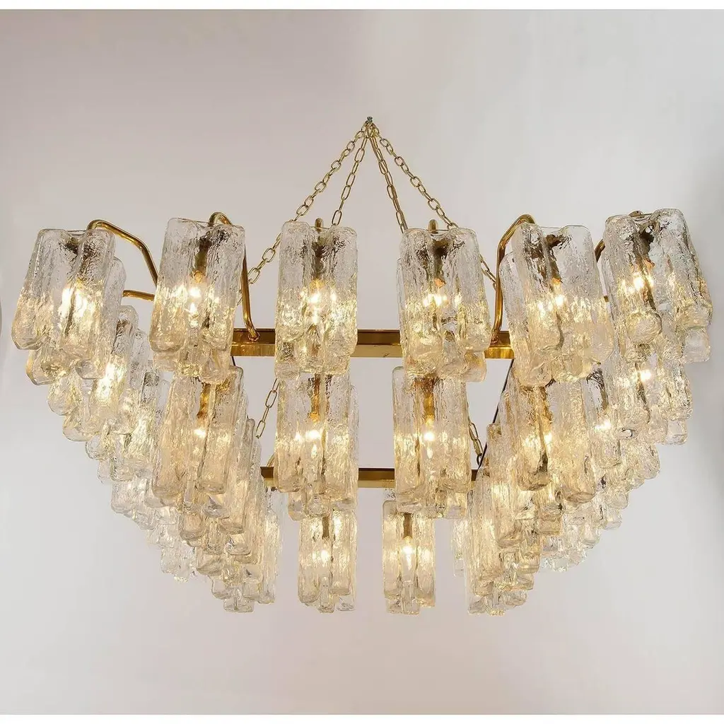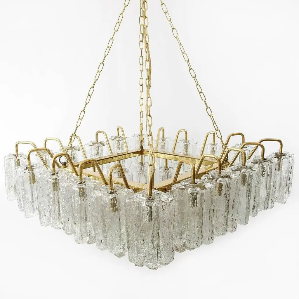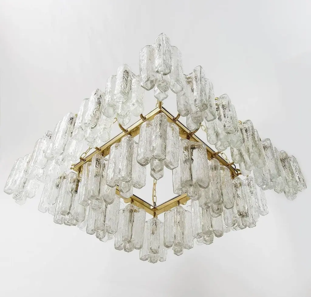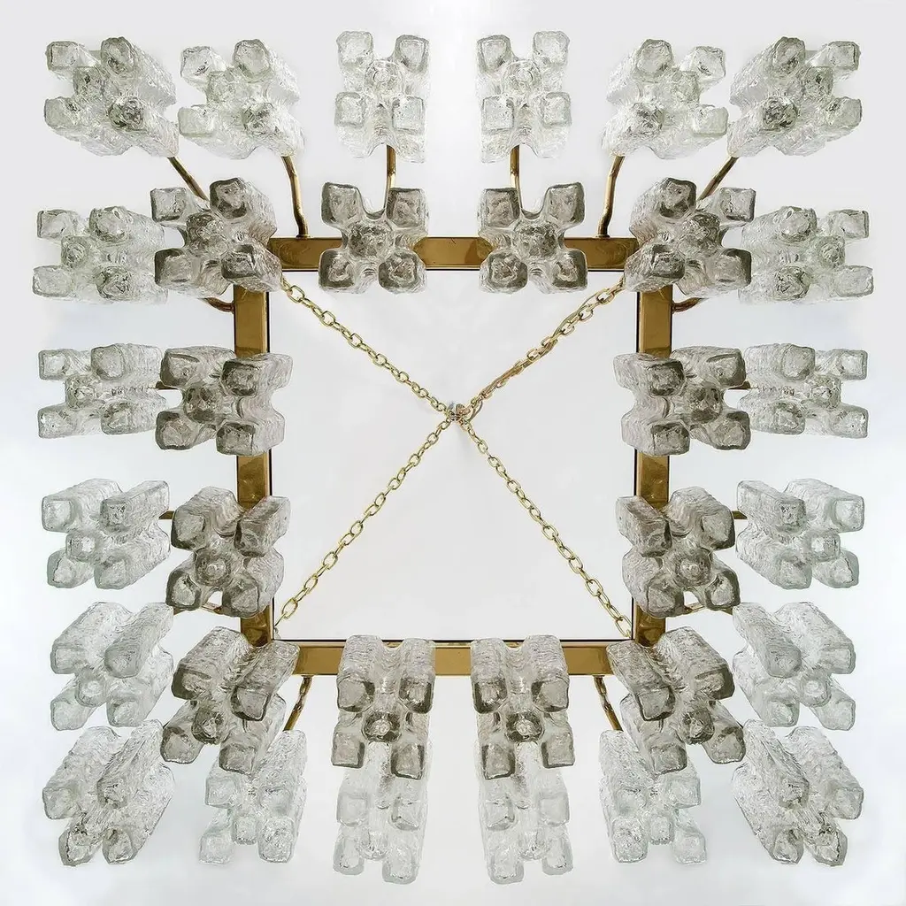 One of two square and very large 'Granada' light fixtures by J.T. Kalmar, Austria, manufactured in midcentury, circa 1970 (late 1960s-early 1970s).The lamps can be used as pendant light / chandelier or as flush mount light because they can be hung very close to the ceiling and the bulbs will be changed from the bottom of the lights.The price is per fixture. They will be sold individually or as pair. Shipping price depends on number of ordered items. The lights are very rare in this dimension. Each fixture is made of a brass frame with 32 bulb sockets which are covered with 'Granada' ice glass lamp shades. Each glass piece has the dimensions of 4.5 x 4.5 x 9.5 inch (11.5 x 11.5 x 24 cm).The fixture is compatible with US/UK/ etc. standards and it is ready to use.It is possible to install this fixture in all countries (US, UK, Europe, Asia, Canada,) although it may be necessary to purchase different light bulbs suitable to local electricity. It has sockets for small Edison screw base bulbs typ E14 which are available in all countries for the country-specific voltage.It also can be used with a dimmer.Dimensions of one lamp:Body without chain: 39.4 x 39.4 x 17.7 inch (100 x 100 x 45 cm) / diameter: 56 inch (140 cm).Current total drop is 47 inch (120 cm). It can be altered to any length for free.