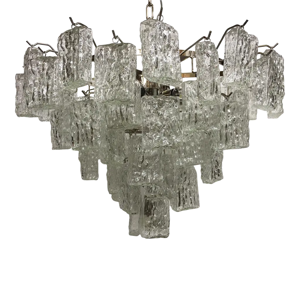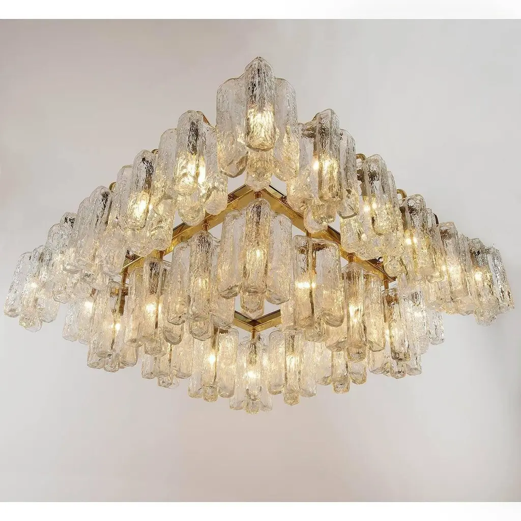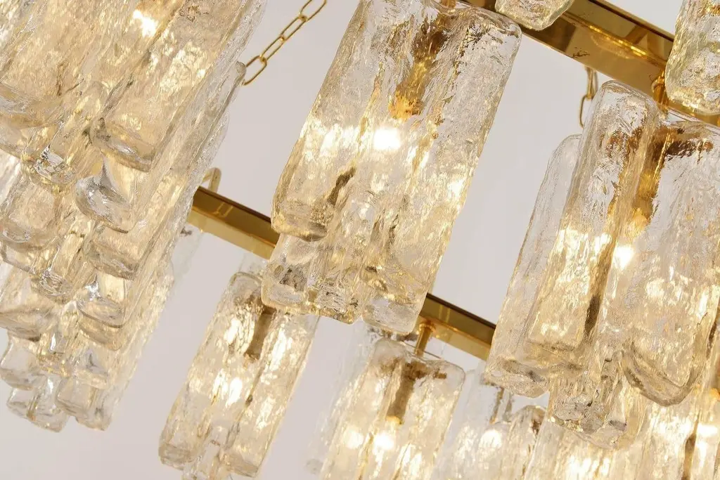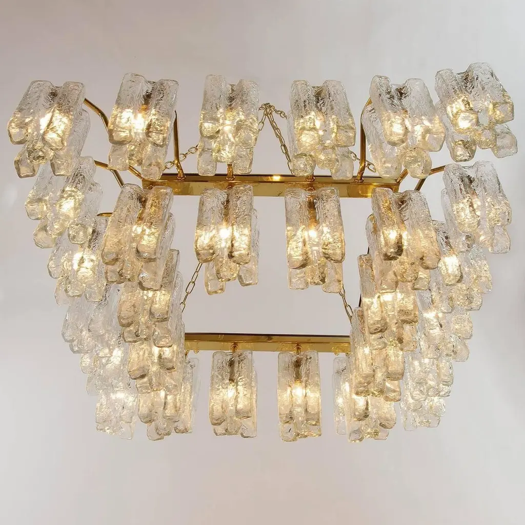 One of two square and very large 'Granada' light fixtures by J.T. Kalmar, Austria, manufactured in midcentury, circa 1970 (late 1960s-early 1970s).The lamps can be used as pendant light / chandelier or as flush mount light because they can be hung very close to the ceiling and the bulbs will be changed from the bottom of the lights.The price is per fixture. They will be sold individually or as pair. Shipping price depends on number of ordered items. The lights are very rare in this dimension. Each fixture is made of a brass frame with 32 bulb sockets which are covered with 'Granada' ice glass lamp shades. Each glass piece has the dimensions of 4.5 x 4.5 x 9.5 inch (11.5 x 11.5 x 24 cm).The fixture is compatible with US/UK/ etc. standards and it is ready to use.It is possible to install this fixture in all countries (US, UK, Europe, Asia, Canada,) although it may be necessary to purchase different light bulbs suitable to local electricity. It has sockets for small Edison screw base bulbs typ E14 which are available in all countries for the country-specific voltage.It also can be used with a dimmer.Dimensions of one lamp:Body without chain: 39.4 x 39.4 x 17.7 inch (100 x 100 x 45 cm) / diameter: 56 inch (140 cm).Current total drop is 47 inch (120 cm). It can be altered to any length for free.