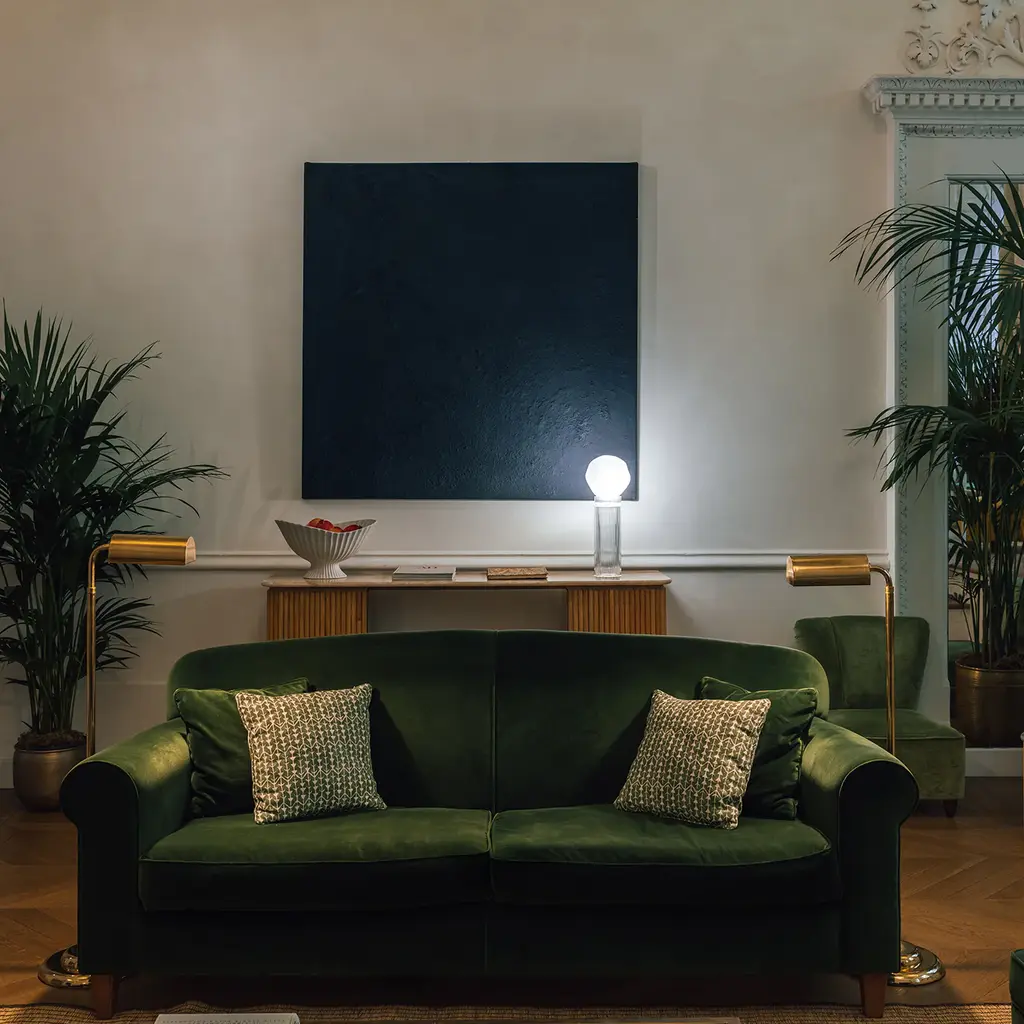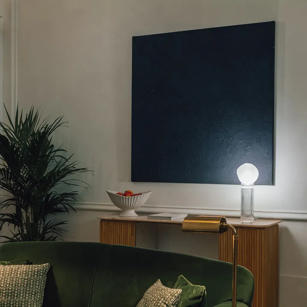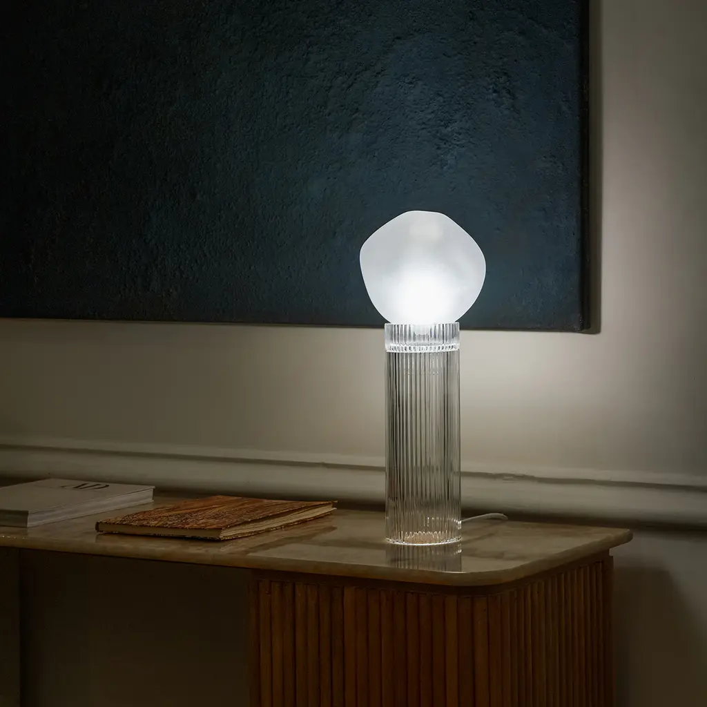 Onna, inspired by Colonna, reinterprets classical majesty with a contemporary touch. Its slender, imposing form echoes the strength of ancient columns. Hand-blown and intricately engraved from lead crystal, it features a clear crystal base and top, creating mesmerizing light effects and reflections. The interchangeable top allows for customization and doubles as an elegant flower vase. The fabric-covered electrical cord adds a refined finishing touch.