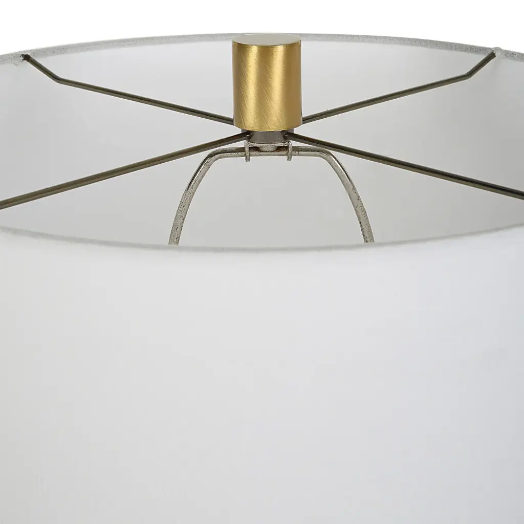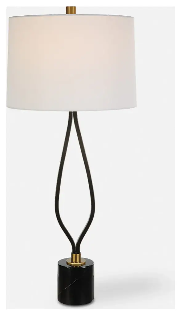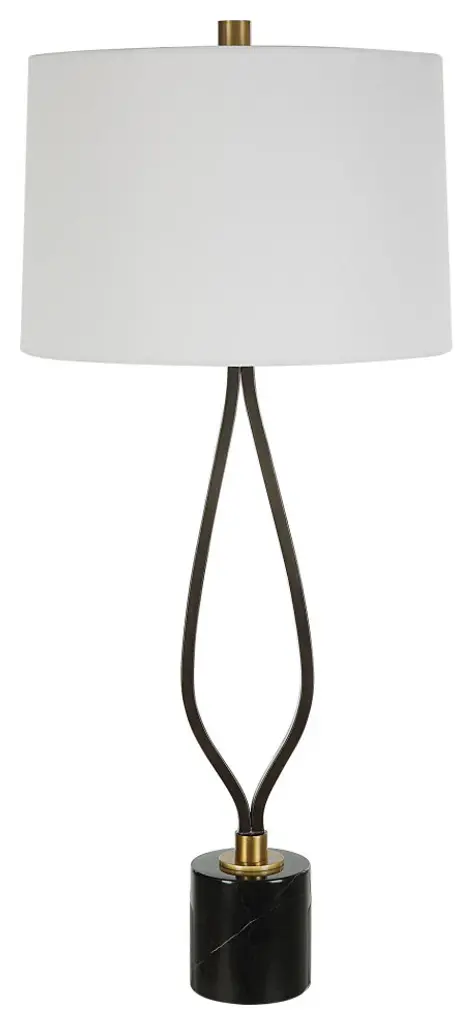 This tall table lamp has a wishbone shaped iron base finish in a rustic black paired with antique brass plated details displayed on a honed black marble foot. The slightly tapered round shade is covered in a crisp white linen fabric.16"W x 16"D x 36"H. Weighs 15 lbs.Hand Finished Iron and Marble. Linen Fabric Shade.UL listed. Uses one max 150W Type A bulb (not included). 3 way socket switch.Heirloom Quality - Expertly hand crafted and hand finished. Due to the hand crafted nature of this piece, each piece may have subtle differences.