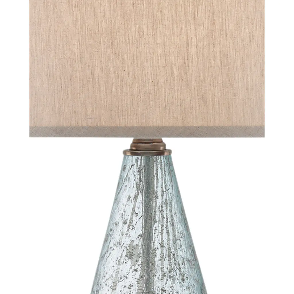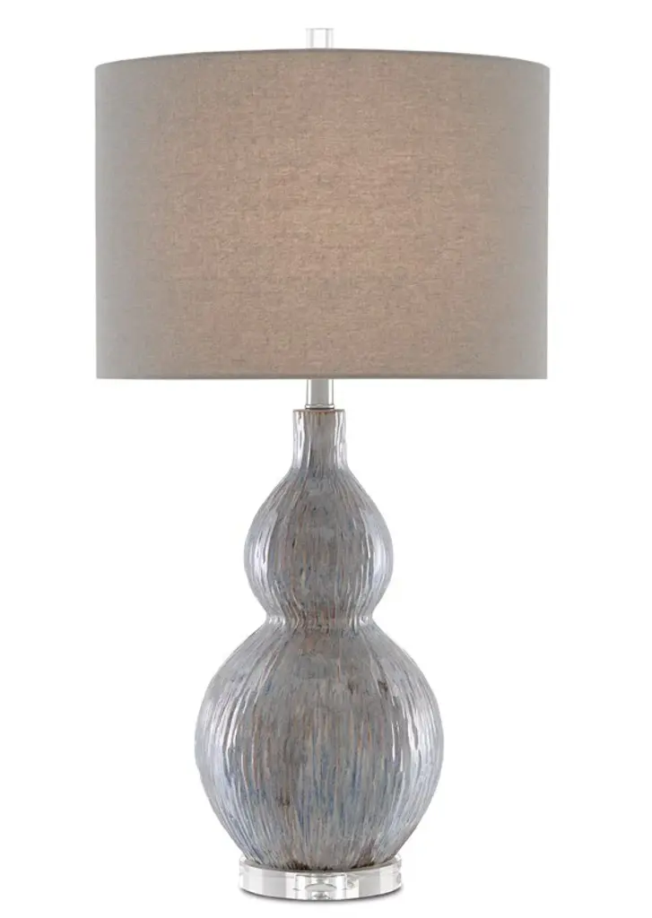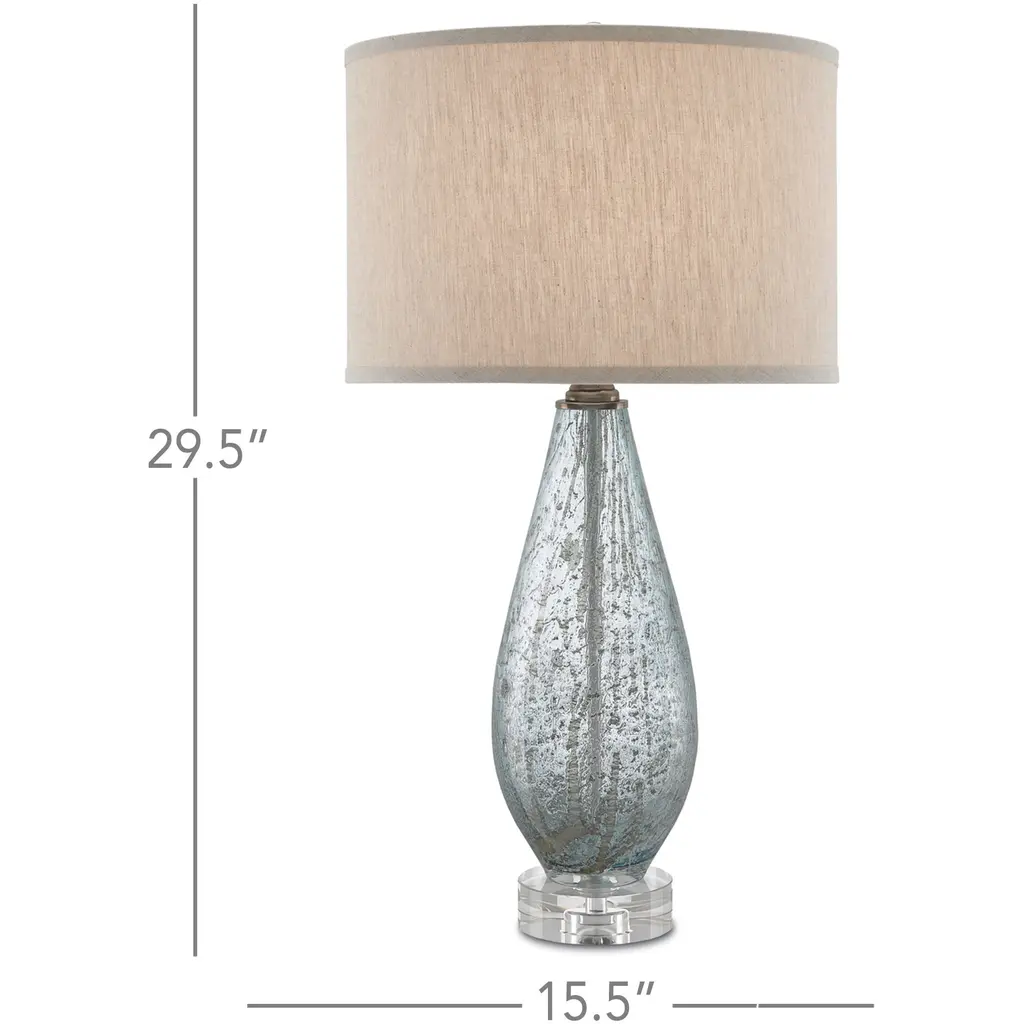 Not unlike the serene beauty of a winter snowstorm seen through a copse of trees, the mouth-blown glass artistry of the Optimist Table Lamp has similar pale blue tones to its speckled glass. The optic crystal base upon which the body perches anchors the lamp. The natural linen shade brings added elemental style to this creation that would bring such loveliness to bedside tables, a special table arranged with elegant accessories or any number of spots in the well-appointed home.