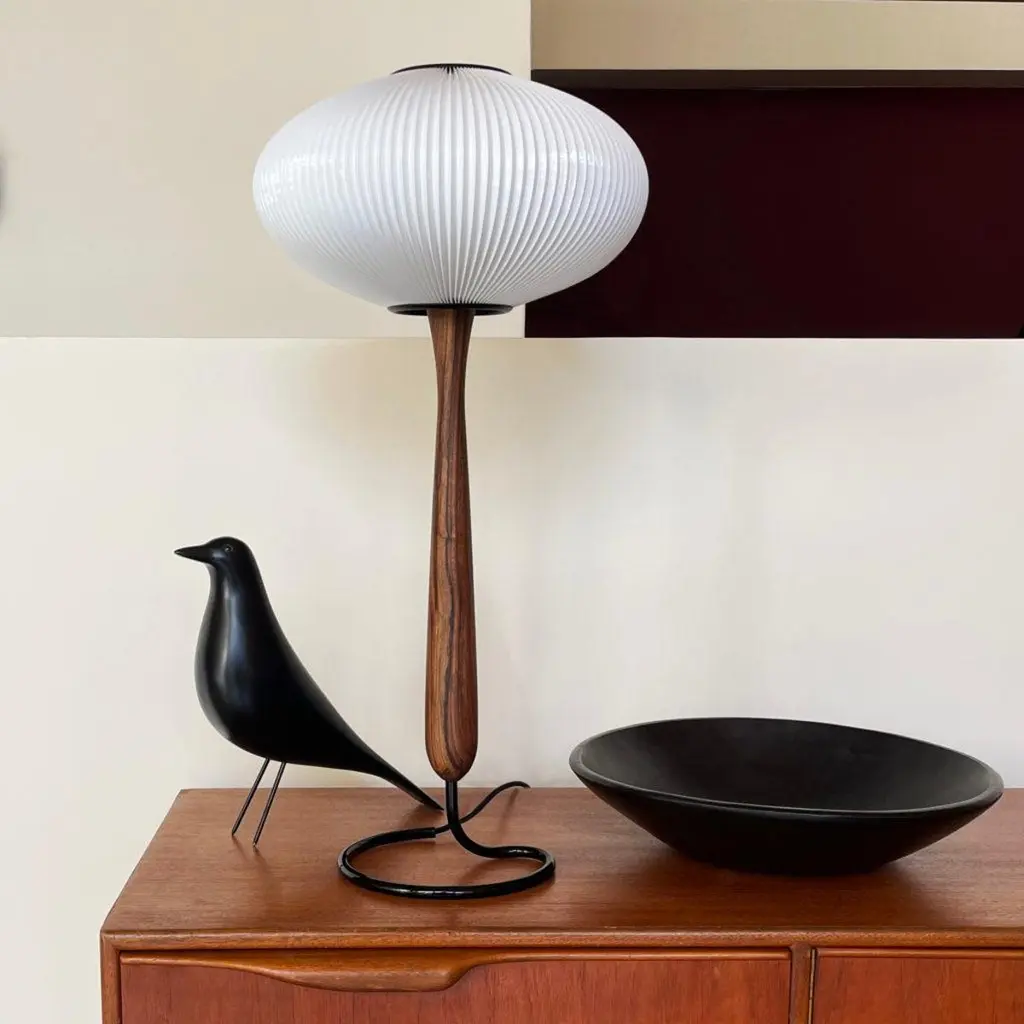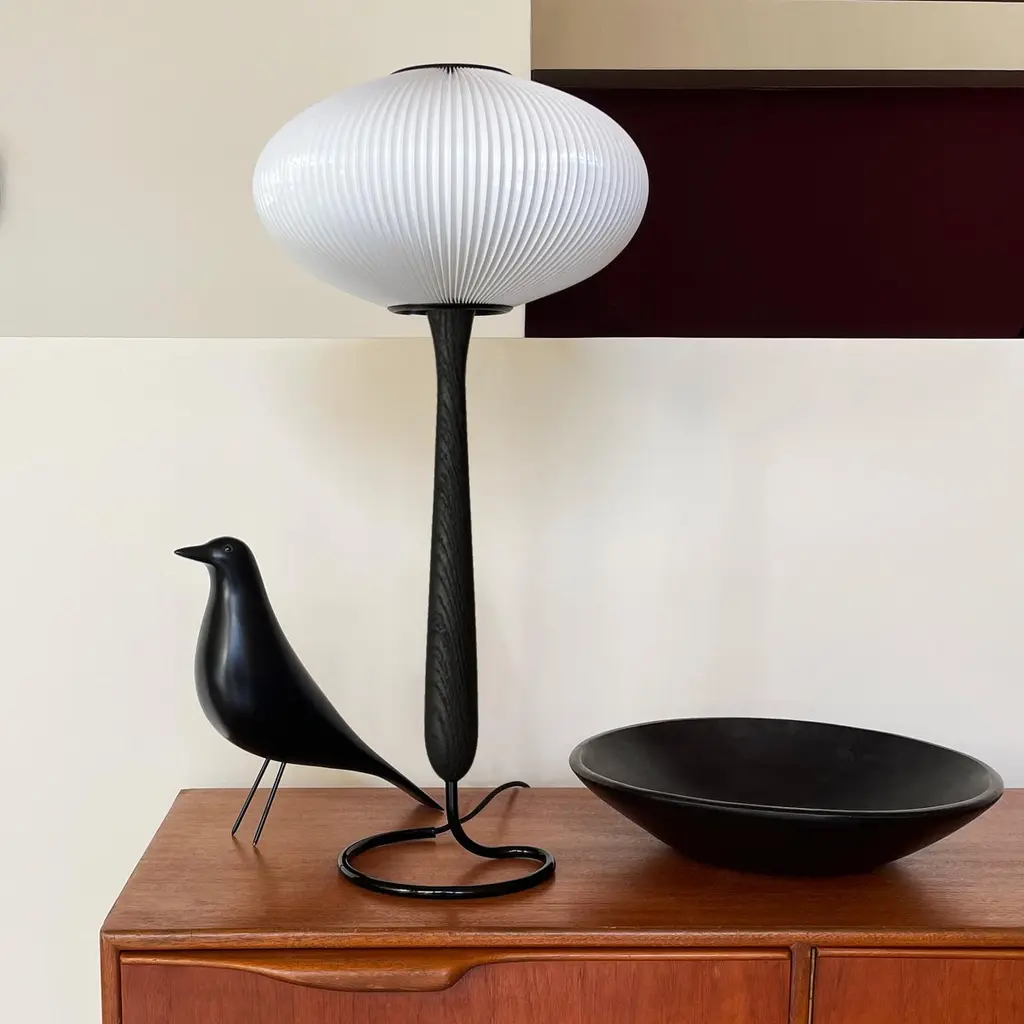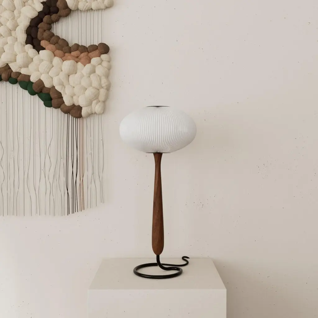 The Opulus draws inspiration from nature, taking the airy lines of the eponymous flowers. The Opulus is the quintessence of the Rispal spirit, using the same lampshade as its big sister, the Praying Mantis. The Mini version features a mouth blown opaline lampshade. The structure is handcrafted in France from noble materials such as oak, ash and walnut and features a black lacquered metal base (different depending on the size of the lamp). The electric cord is in anthracite grey fabric but other colors available upon request.Georges Léon Rispal founded his lighting company in Paris in 1924, achieving notable success by the early 1950s with the “Formes Nouvelles” catalog, which offered avant-garde lighting influenced by Scandinavian design. Inspired by Rispal’s innovative approach, Douglas Mont relaunched the iconic models, preserving the brand’s original style and avant-garde spirit.Available in differet finishes:• Black Ash• French Walnut• Natural Ash• Natural Oak• Vintage OakDIMENSIONS:Small: 8"W x 17"HMedium: 11”W x 24”HAvailable in different options, please inquire with us.