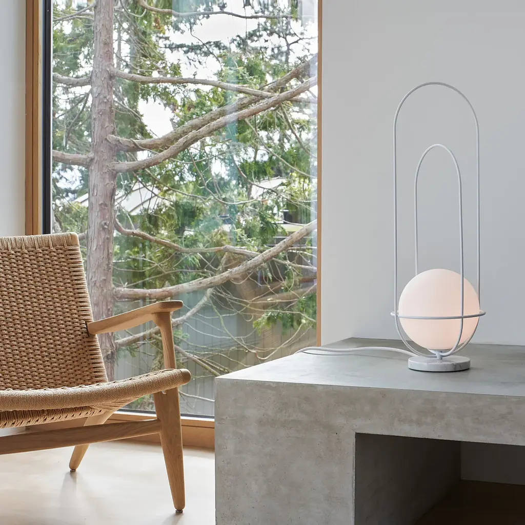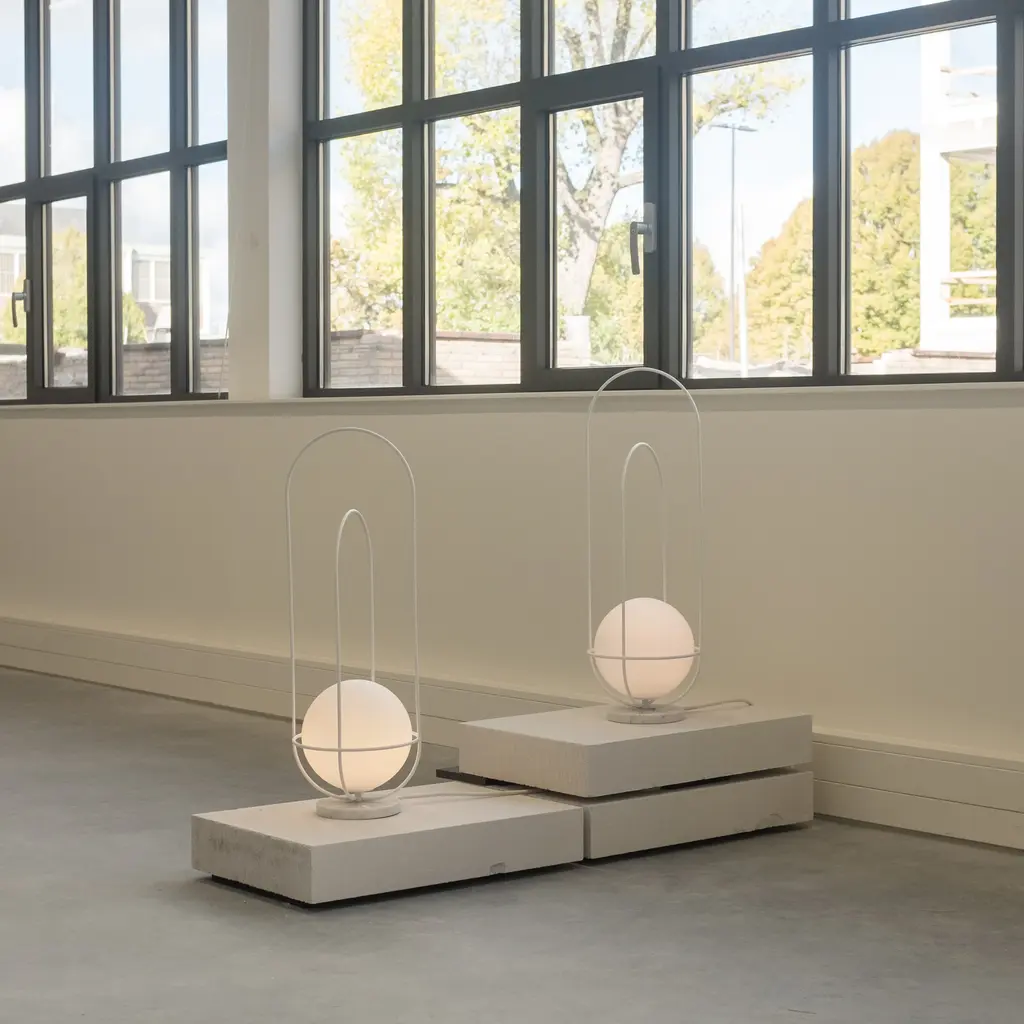 Lukas Peet’s celestially inspired Orbit gets a luxe extension as a table lamp with a marble stand. Playing on the theme of planetary orbits around the sun, the designer encases his glowing glass orb in an encircling metal framework to complete the allusion. Similarly, the opalescent glass spreads a sunny glow on its immediate surroundings.
