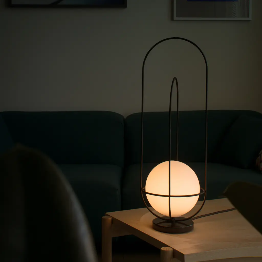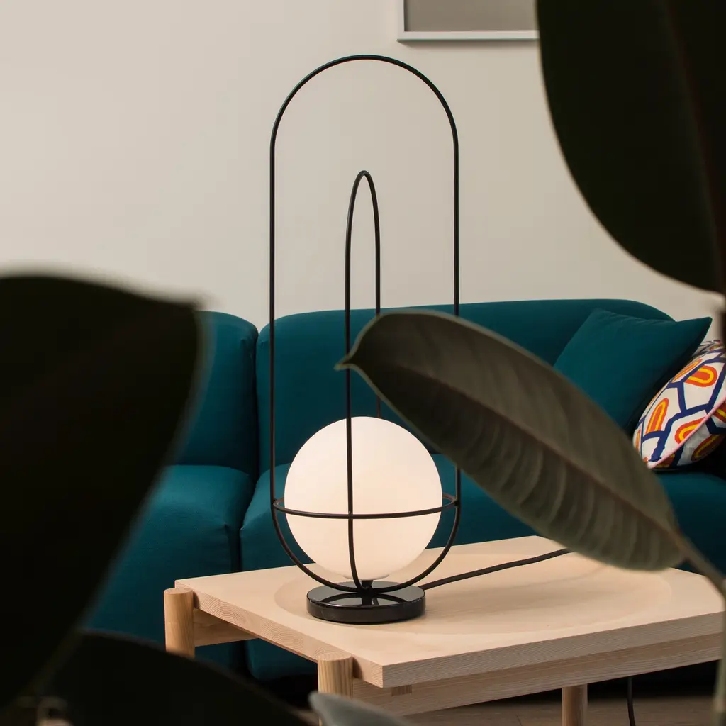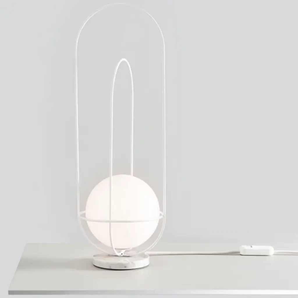 Lukas Peet’s celestially inspired Orbit gets a luxe extension as a table lamp with a marble stand. Playing on the theme of planetary orbits around the sun, the designer encases his glowing glass orb in an encircling metal framework to complete the allusion. Similarly, the opalescent glass spreads a sunny glow on its immediate surroundings.