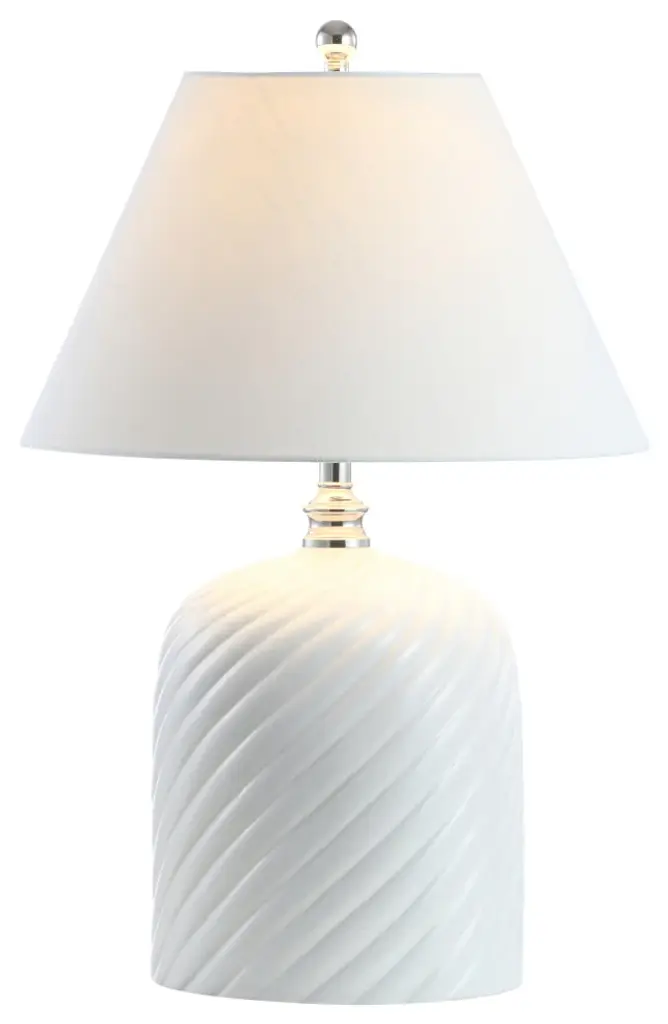 Dazzling platinum swirls orbit around a ceramic lamp body in glossy white sitting atop an acrylic base.