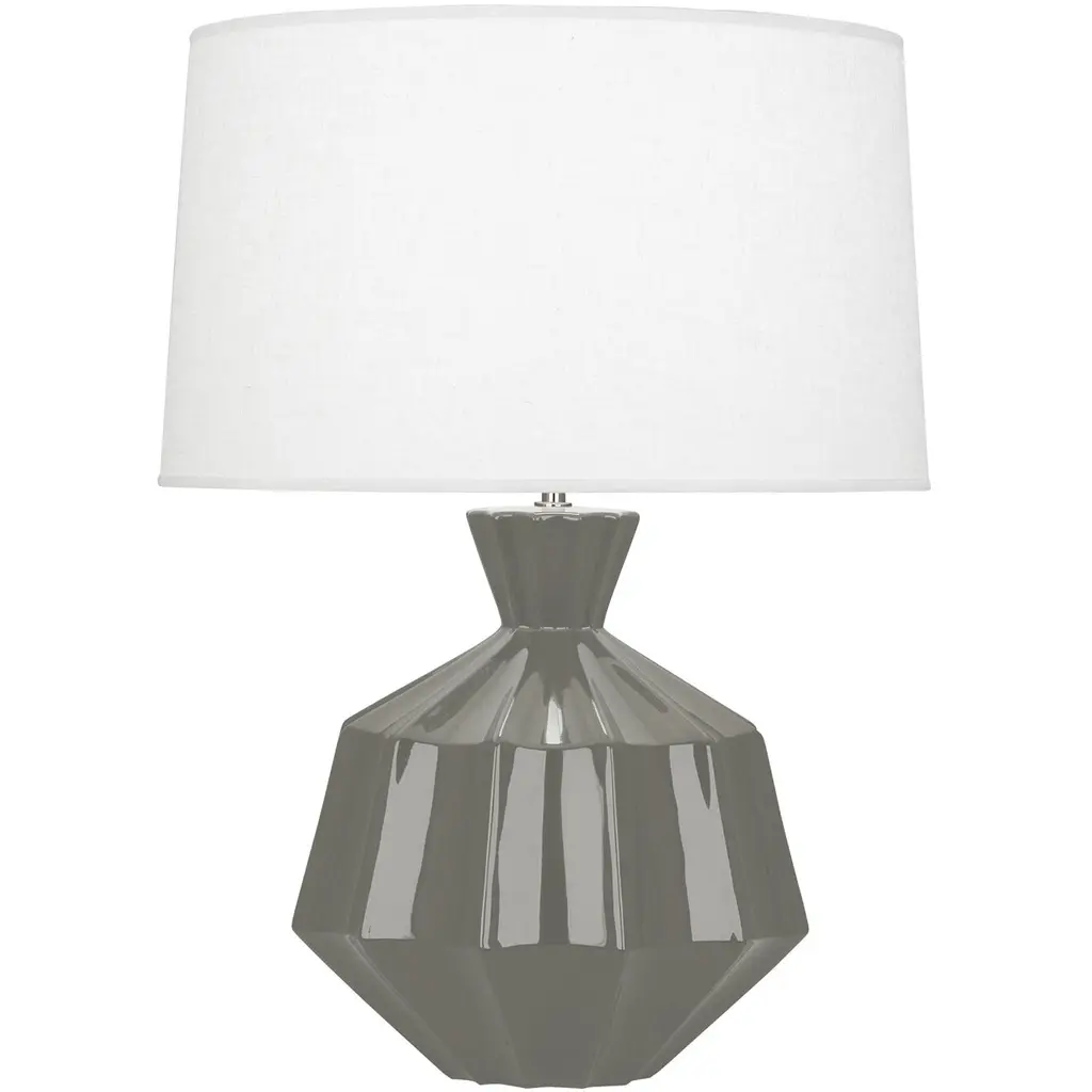 Matte Midnight Blue Orion Contemporary Table LampFeaturesNumber of bulb: 1Bulb type: AMax wattage: 150WVoltage: 120VSocket: Medium Plated Sheet E26Switch: Hi-LoSwitch location: SocketFinish: Matte Midnight Blue Glazed CeramicShade: Oyster Linen Shade with Self Fabric Top DiffuserCord color: SilverUL listed: DryDimensionsShade dimensions: 18 inches top x 19.5 inches bottom x 11.5 inches down sideBase dimensions: 14.75 inches height x 13.63 inches width