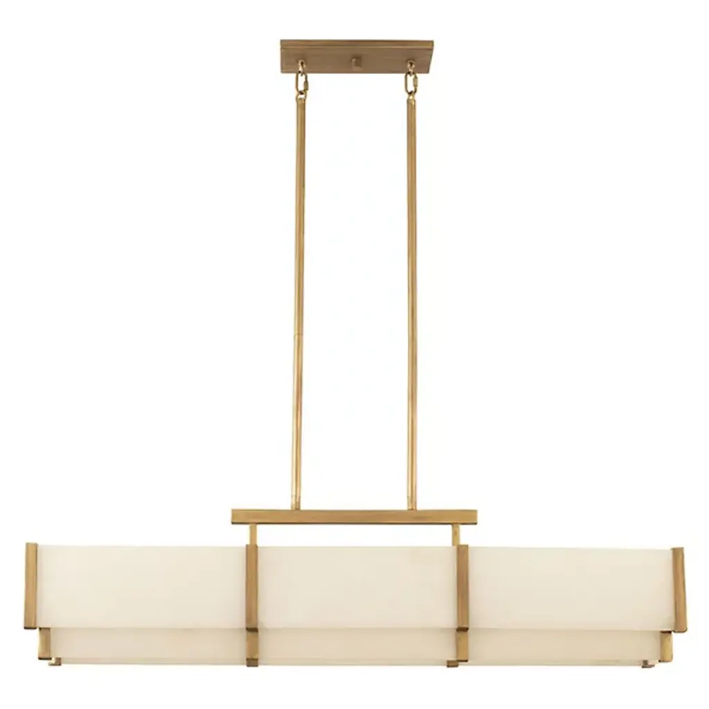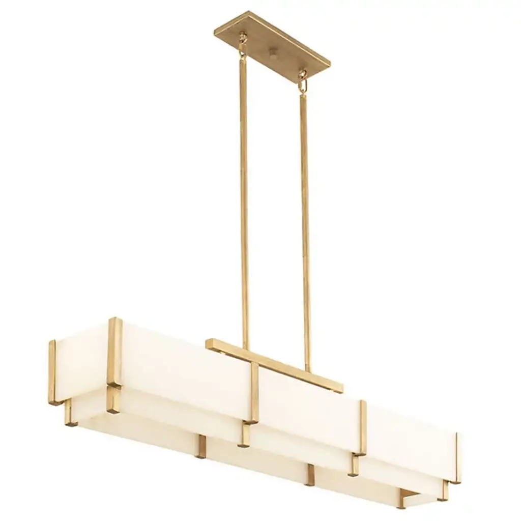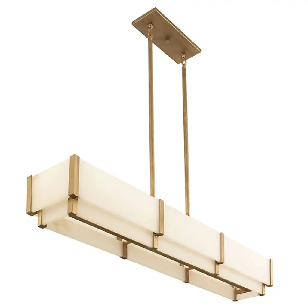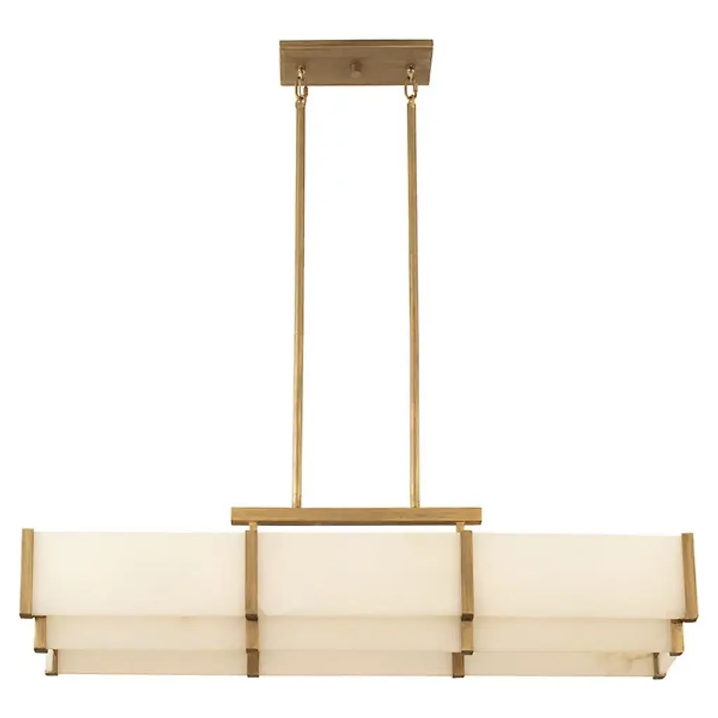 Tasteful and layered with vintage intricacy, the Orleans Linear Suspension from Savoy House gives Art Deco style an organic twist. A rectangle canopy and parallel downrods suspend lamping within a layered rectangular shade assembly that juxtaposes panes of natural alabaster with small metal bands that join them. The translucent alabaster obscures the lights, creating a bright yet comfortable glow while dispatching the downlight below.