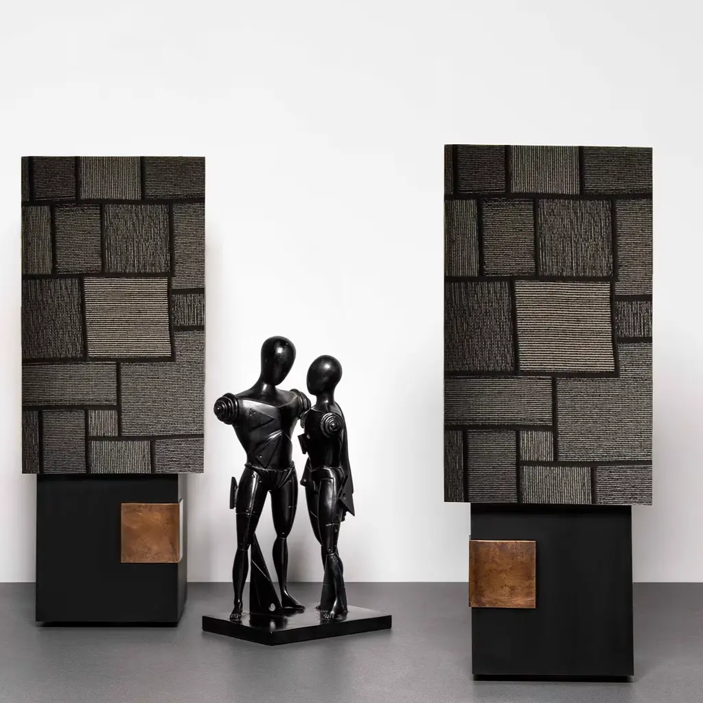 Table lamp with base in top-quality African ebony wood. The bronze detail functions as a touch switch by means of a sensor that dims the led circuit.