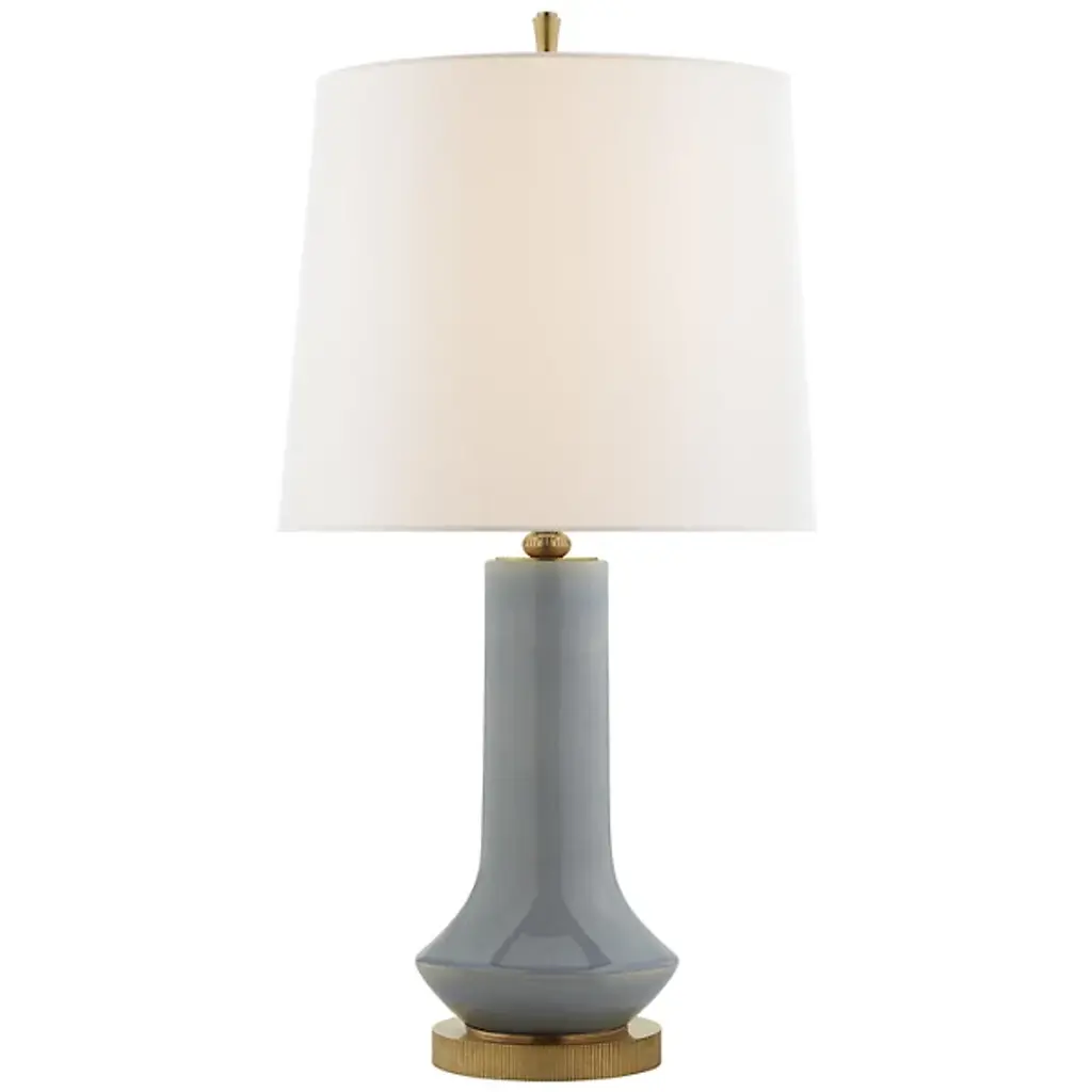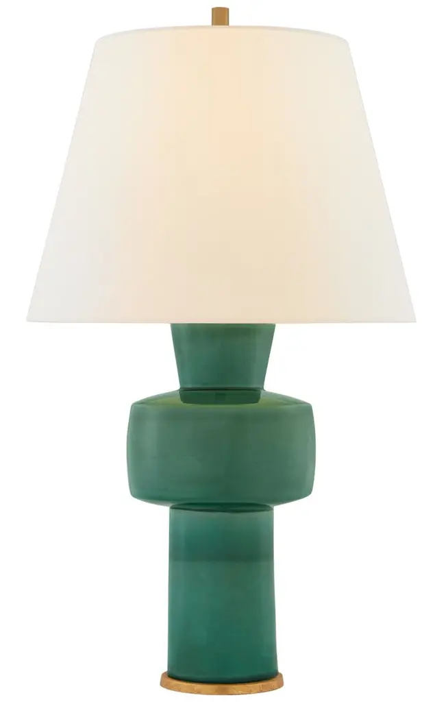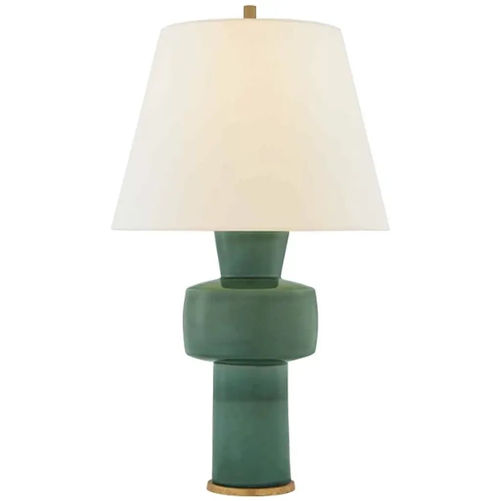 From legendary designer E. F. Chapman, this table lamp shows off a smooth, enticing silhouette and glossy kiwi-green finish. Accented with brass details and a linen barrel shade.