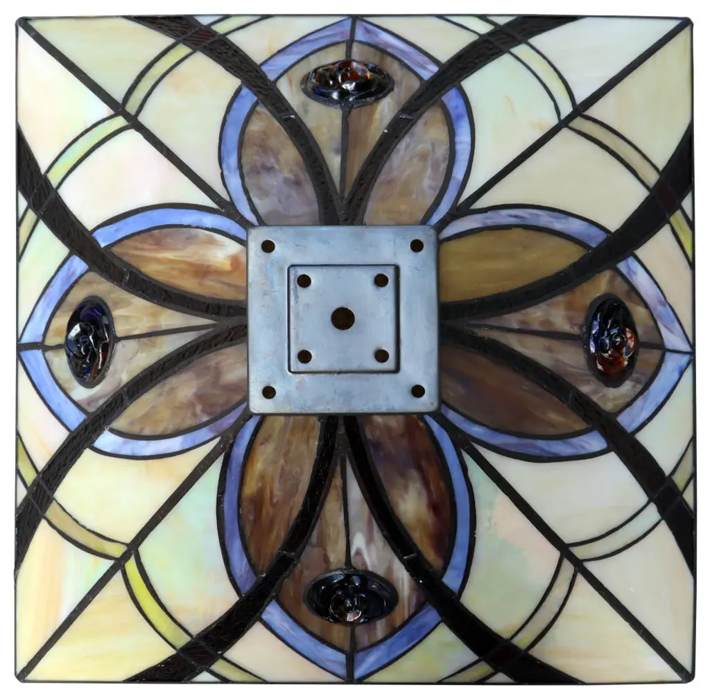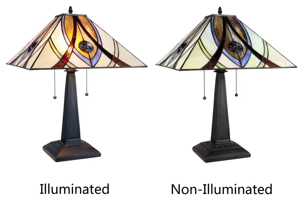 Orson is a beautifully designed mission-style, stained glass table lamp. This lamp is made up of 112 pieces of hand-cut stained art glass and 4 glass beads, expertly pieced and soldered together to create each shade. Each shade is formed using the very same technique developed by Louis Comfort Tiffany in the early 1900s, using hand-cut stained art glass, each wrapped in fine copper foil and soldered together at extremely high temperatures to form each unique shade. The exact size to the nearest inch may vary, and the exact color of each glass piece may vary due to each piece being handcrafted. The first image is with the light shining through, the second image is with no light. Dry-listed and recommended for an indoor setting.