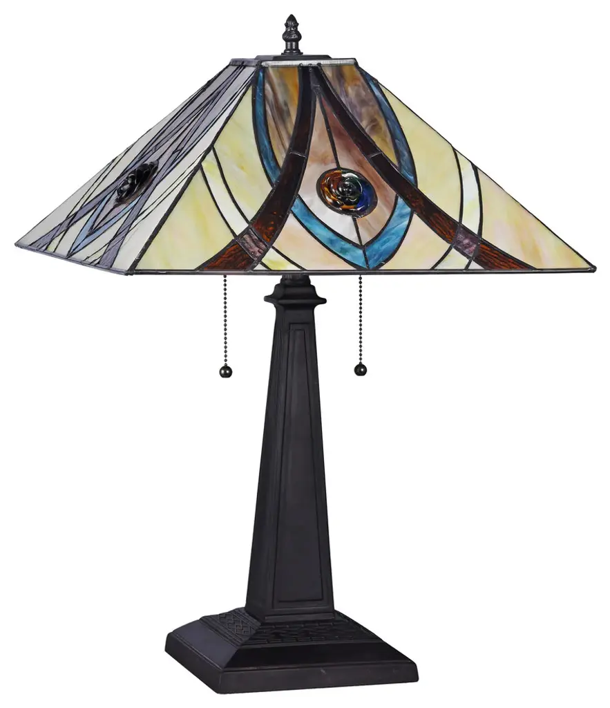Orson, a Mission Tiffany-style 2 light blackish-bronze Mission table lamp features paint-like strokes in it beautiful glass design, sure to complement your home. Hand crafted from over 110 pieces of art glass and 4 beads that will add color and beauty to any space. Main colors are red, green and blue. Handcrafted using the same techniques that were developed by Louis Comfort Tiffany in the early 1900s, this beautiful Tiffany-style piece contains hand-cut pieces of stained glass, each wrapped in fine copper foil.(2) 100 Watt max E26 Type A Bulb (not included)Pull chain112 pieces glass cut, 4 glass beadsDownlightIndoor SettingSince these are hand crafted products, the exact color of glass pieces may vary. Colors of the glass will appear darker and less vibrant when not illuminated. Handmade glass will vary from one piece to the other; glass made at different times will also vary. Light bulbs used in lamps or ambient lighting may affect the appearance of the products. Stained glass product has been protected with mineral oil as part of the finishing process. Please use a soft dry cloth to remove any excess oil.