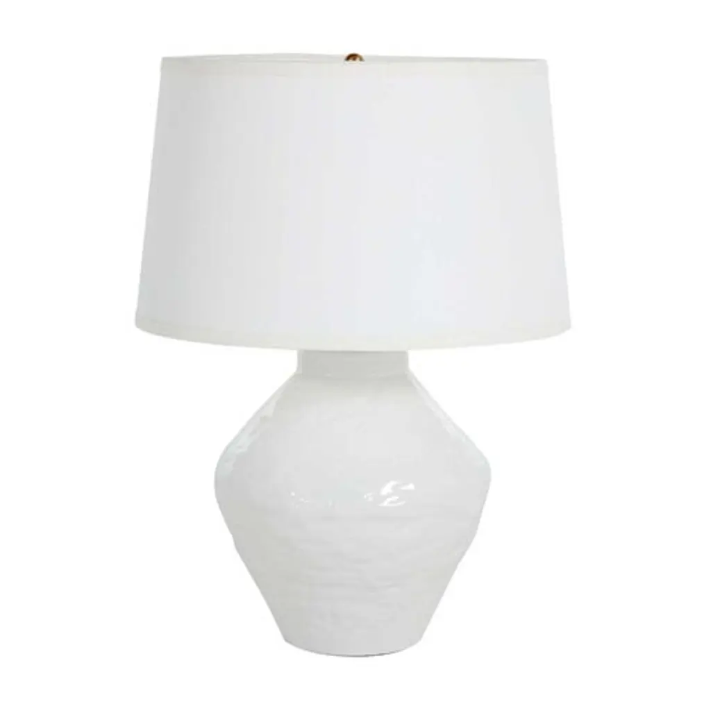 The simple all white ceramic base of the Osborn Table Lamp is heavily textured and completed with a white linen shade for a monochromatic accent lamp that pairs well with many decor styles. Slight difference in height is expected for this handmade lamp.