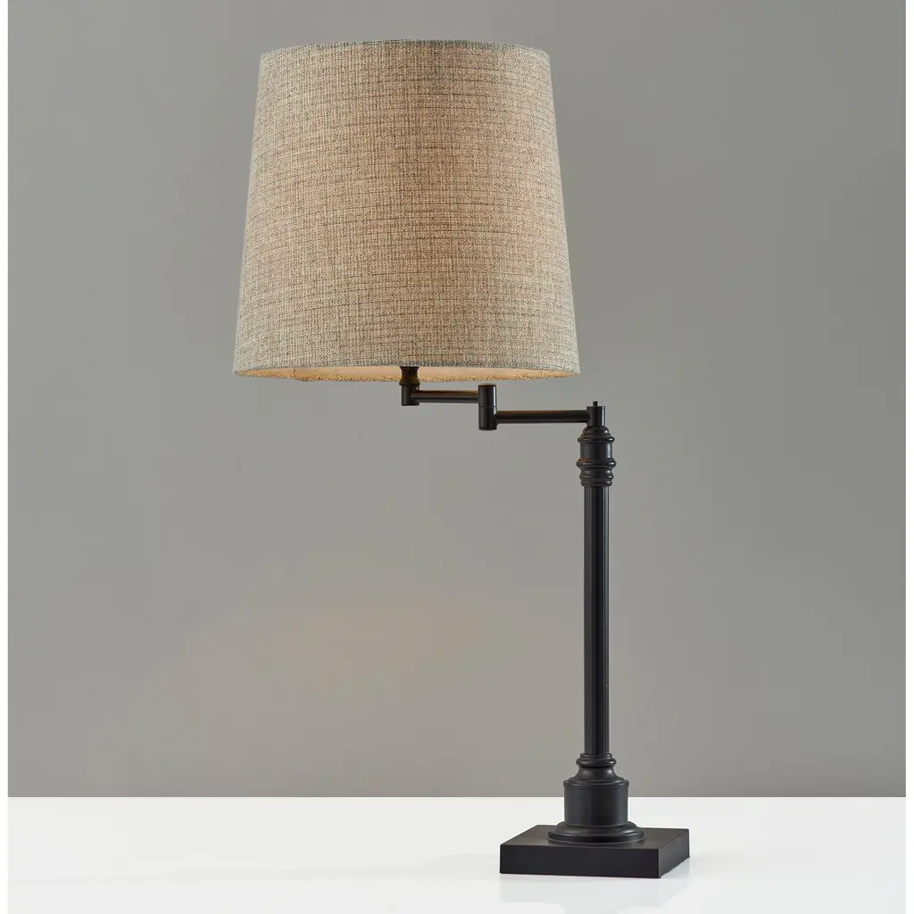 Introducing our timeless and classic 1 Lt Table Lamp, where elegance meets functionality. Crafted with an oil rubbed bronze finish and adorned with a natural fabric shade, this lamp exudes sophistication in every detail. Its adjustable swing arm offers versatility, allowing you to direct light exactly where you need it. Perfect for any space, from cozy reading corners to elegant living rooms. With a 150W Type A bulb and a convenient 3-Way Socket Switch, it effortlessly blends practicality with enduring style. Illuminate your home with a touch of timeless charm with dimensions of 15 inches wide by 29 inches high by 20.5 inches deep.