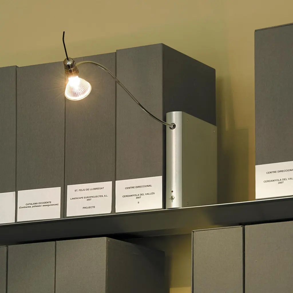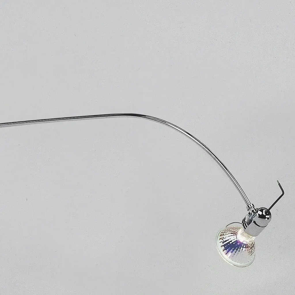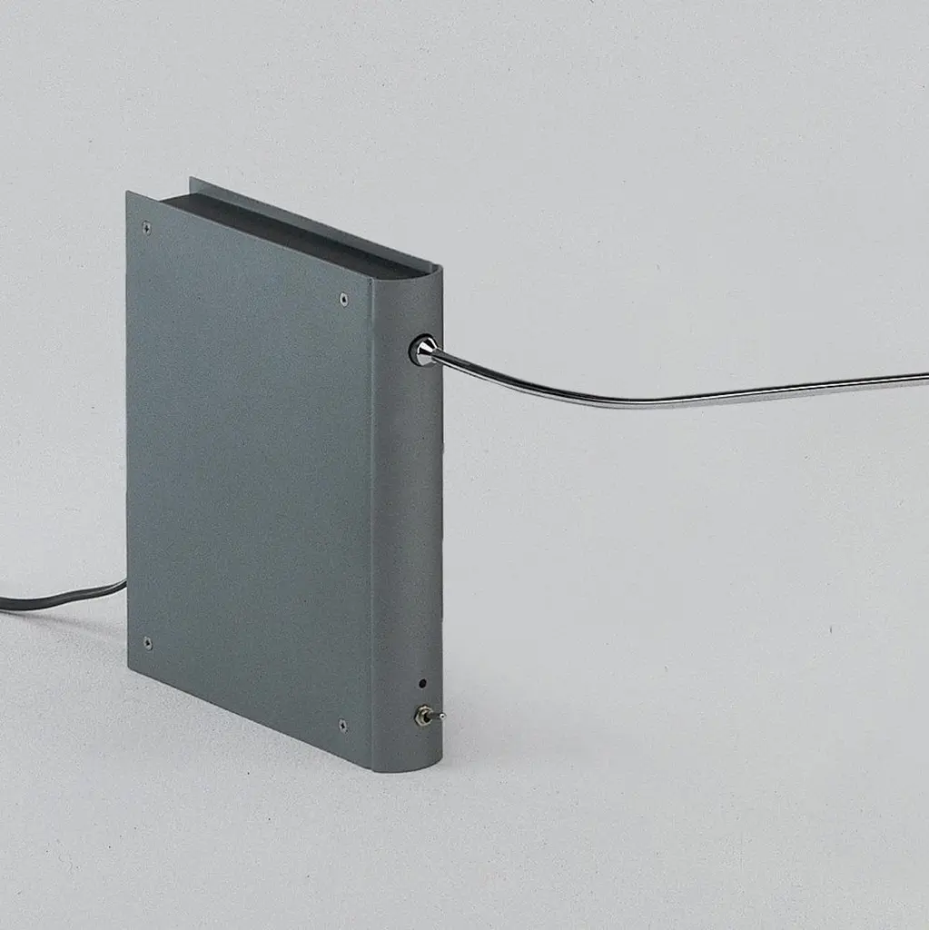Aluminium box with a grayish green matt metallic finish, containing the transformer, the two-way dimmer switch and off-indicator diode.Swivel shaft in chromed brass available in two sizes, 40 or 65cm.Revolving lamp-holder, of 90º, in chromed brass.Base in iron plate to give stability to the lamp.Halogen bulb GU-5.3 bi-pin, of max. 1x50W 12V/50Hz, or 1 LED bulb of 6W included.Certified CE UNE-EN 60598-1.This lamp is wired for Europe, if used anywhere else it might need to be convert by the client.Measures: 20 x 83 x H 27 cmYear: 1985-1989.