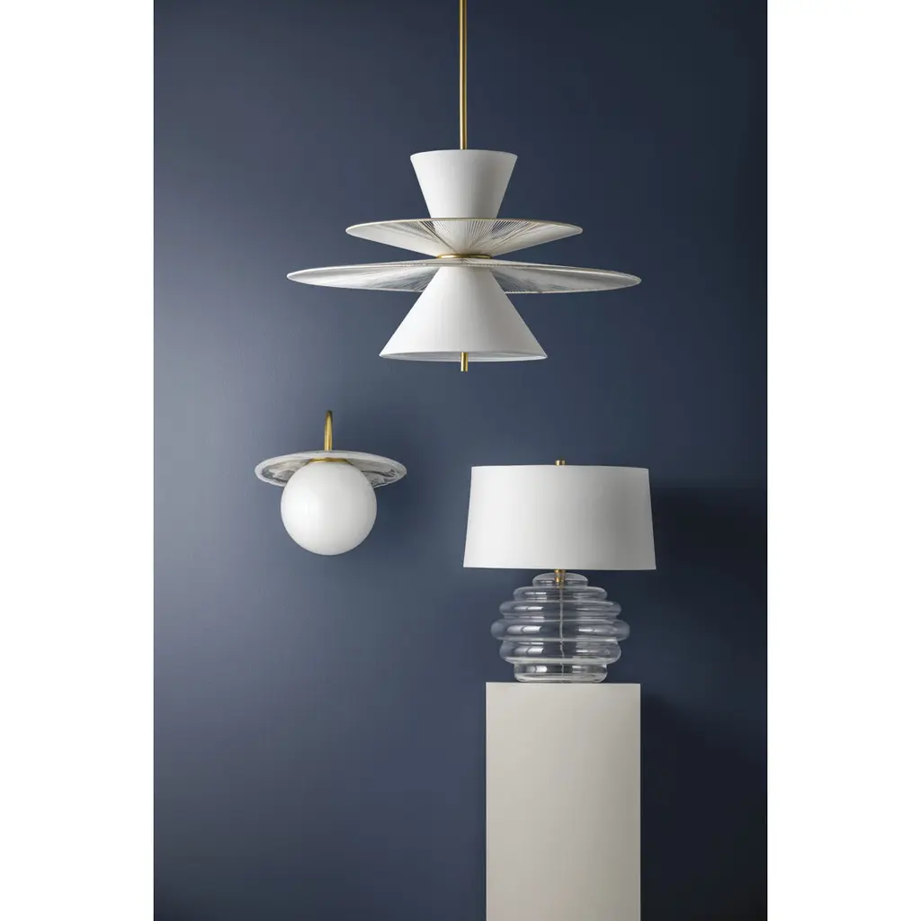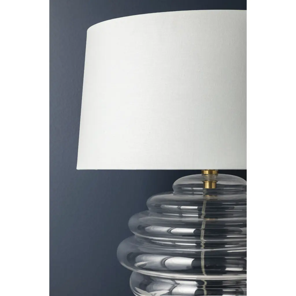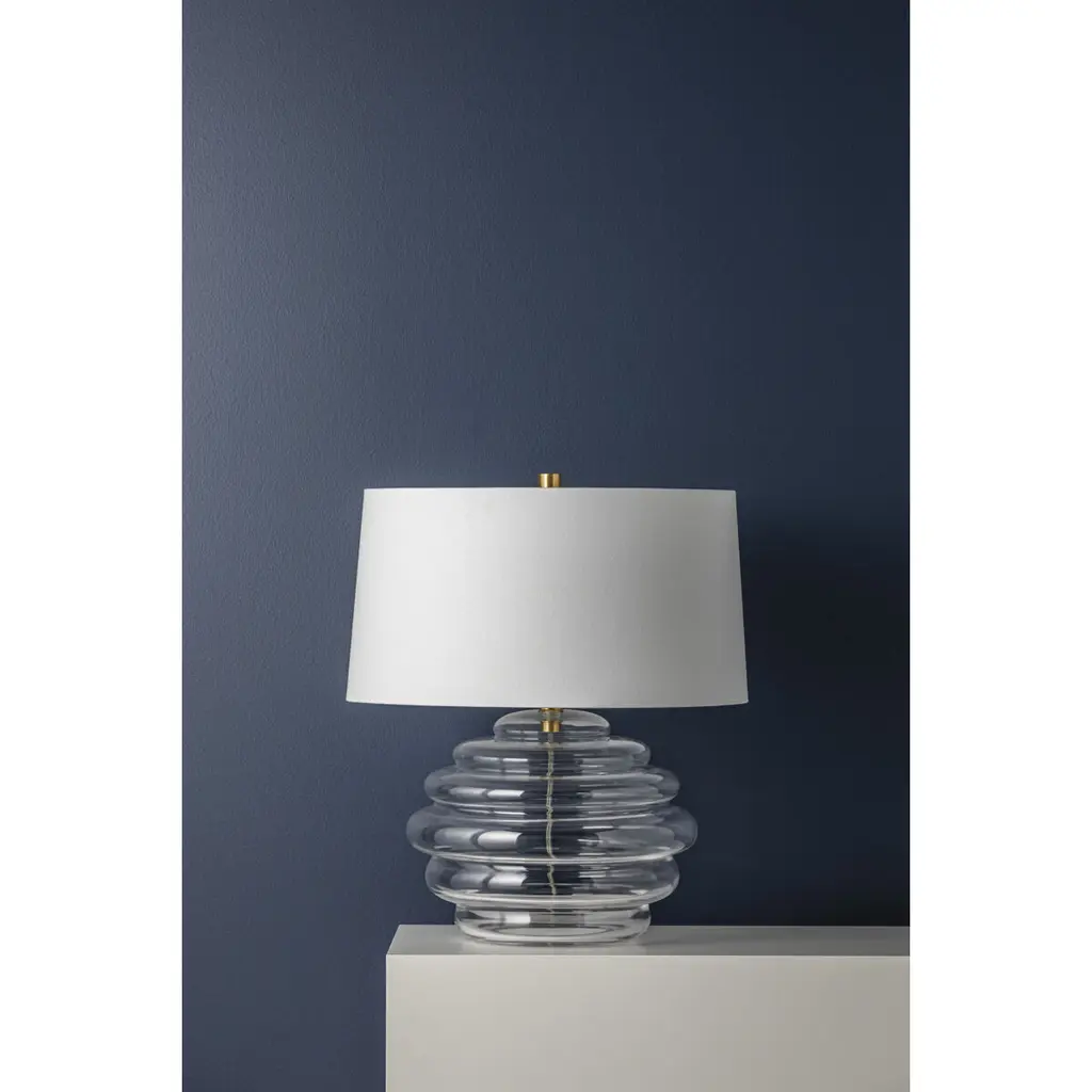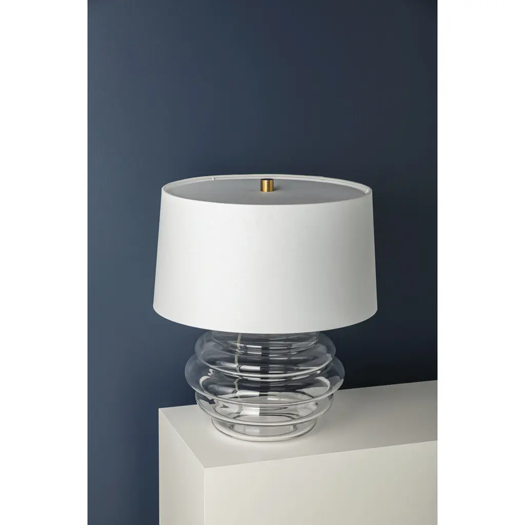 A poetic interpretation of a bubble, Oshawa is light as air with a minimal, yet impactful presence.Made from clear glass, this artful table lamp is complemented by a subdued and calming whitelinen shade. The Aged Brass frame, visible at the neck, adds a metallic glimmer.