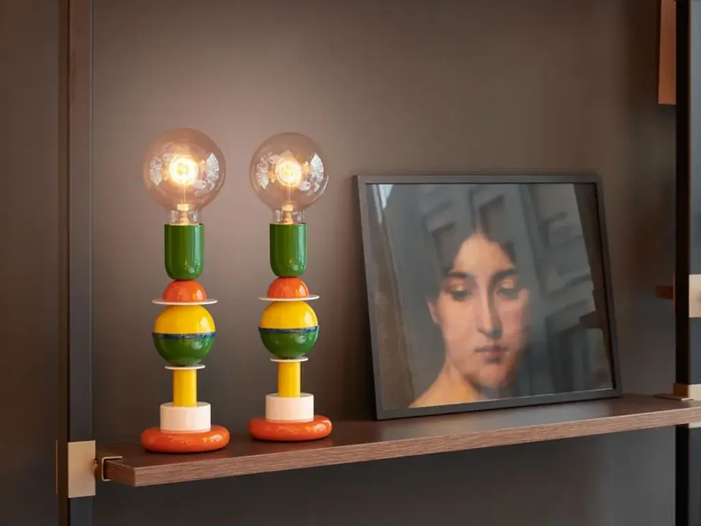 Otello Mini table lamp in the "pocket" version of Otello, of which it maintains the same energy and vitality, but with a slightly lower height. The stem, made by a harmony of geometric shapes and strong colours, is a contemporary reinterpretation of the great icons of Italian Desing of the last century; a retro bulb completes Otello Mini and creates a soft light.1 x 30W - E27G95 retro decorative bulb - includedWarm light 2000 K60 lumensBlack power cable with switch