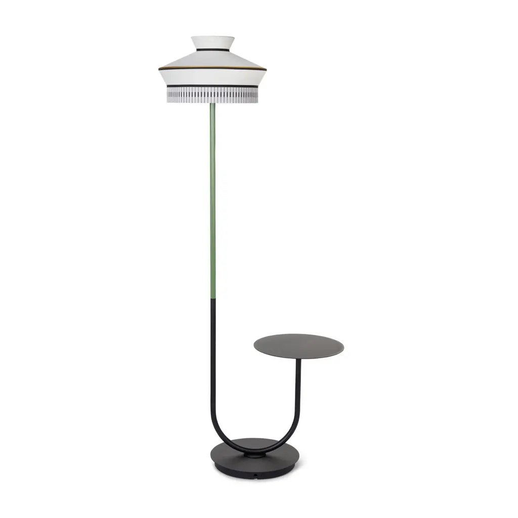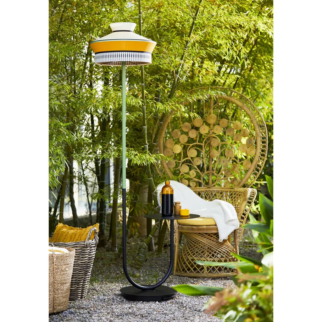 Elevate your outdoor space with the luxurious Calypso Outdoor Table Floor Lamp by Contardi. Featuring a sleek black lacquered base and a vibrant green lacquered top, this lamp is not only waterproof but also comes with a table for added convenience. The glass cylinder houses the light source, providing an elegant and protected illumination to your outdoor gatherings.