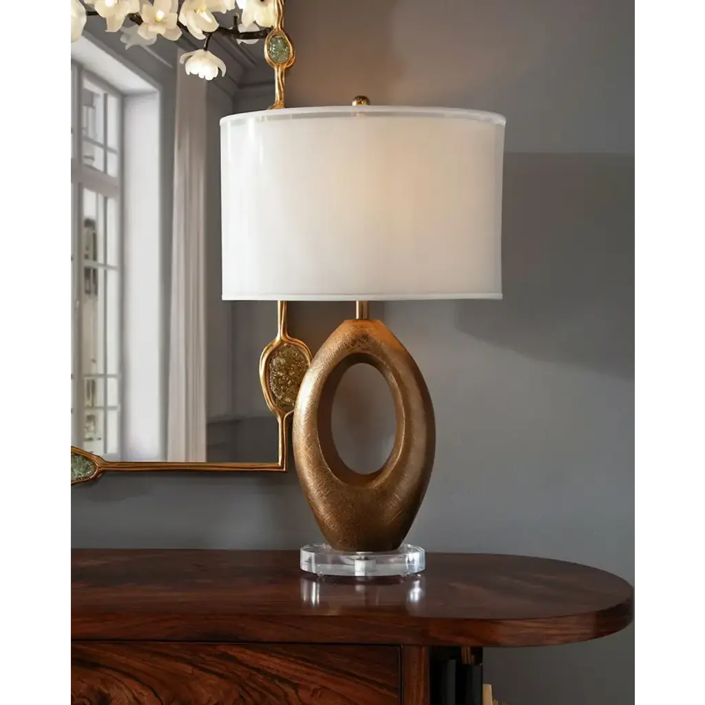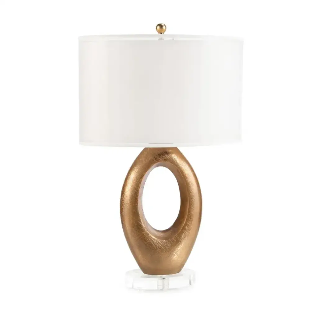 This artistic turnkey lamp features a striking ovate profile in a brass finish with textural etchings across the entirety of the body. The center of the piece displays alluring bevels that line the interior, providing subtle juxtaposition to the curvaceous silhouette. A rounded base of clear acrylic provides the piece with stable support, as well as providing tasteful contrast to the warm metallic tones. The hardware and finial, also in brass, complete the look and provide a consistent motif throughout the piece.