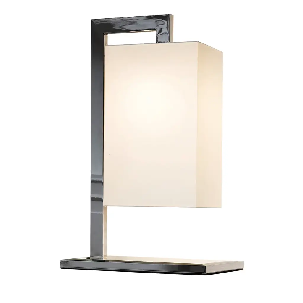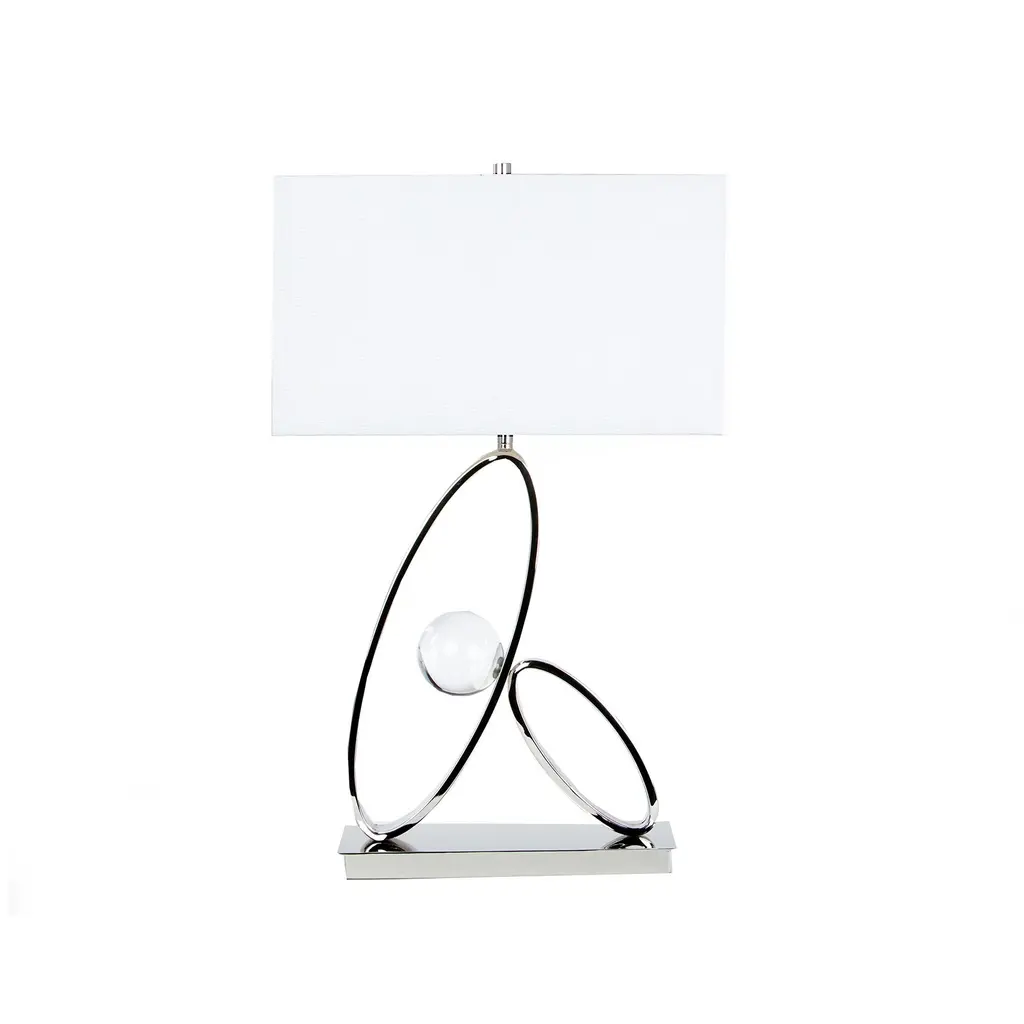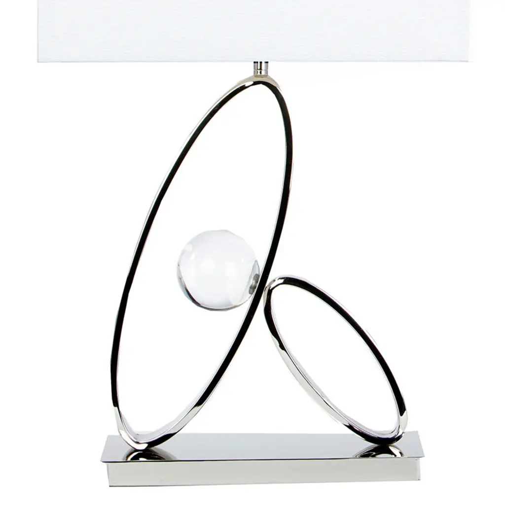 Create balance with this contemporary table lamp featuring a simple yet striking base with two chrome rings in perfect equilibrium. A crystal ball lends harmony to the artful arrangement, while the linen shade softens light for seating areas and bedrooms. Specs:Light Bulb Type: Halogen 150 Watts Dimensions: 17.5 x 8.75 x 28 inches Fixture Material: Metal and Crystal Shade Material: Linen Chrome Finish 3 Years Limited Manufacturer Warranty