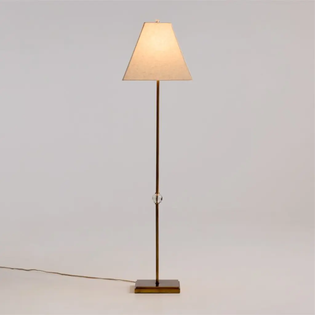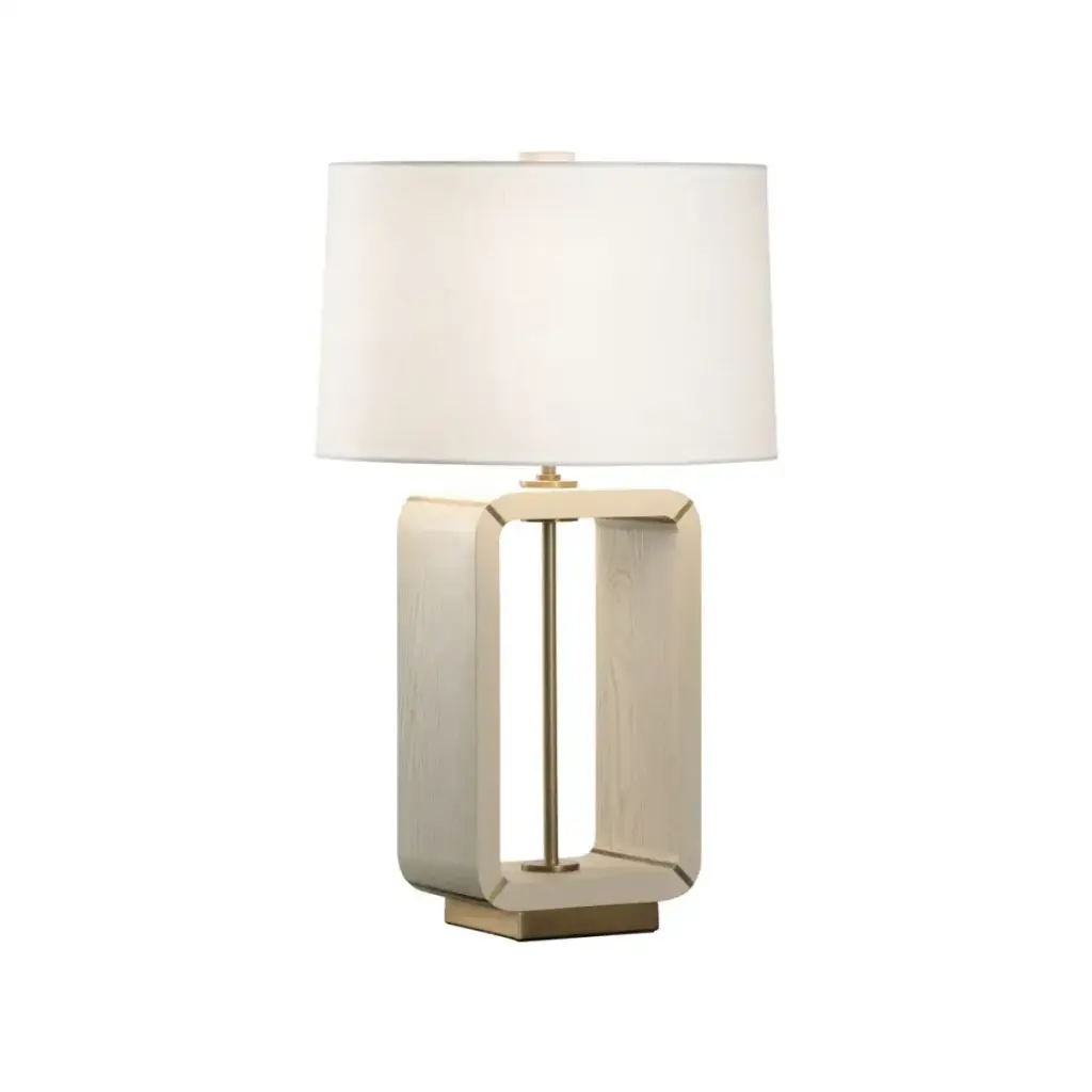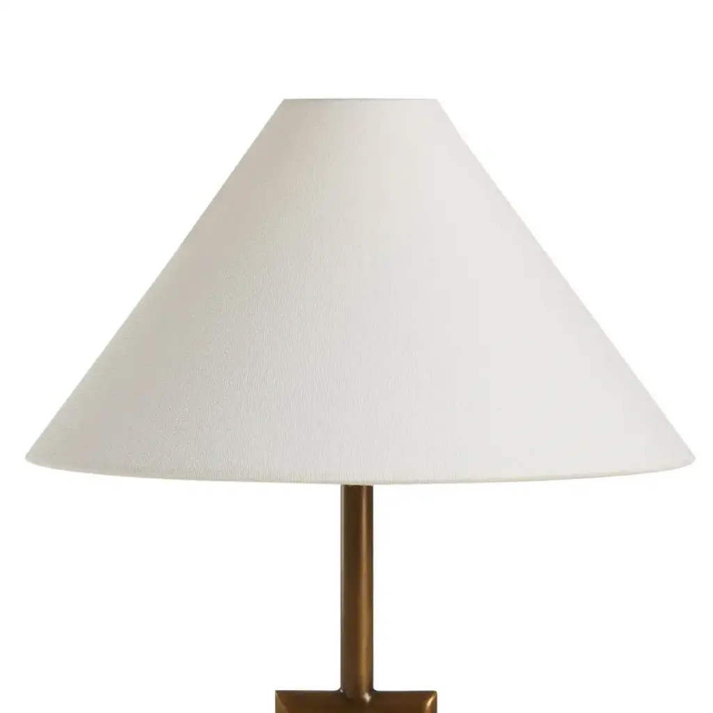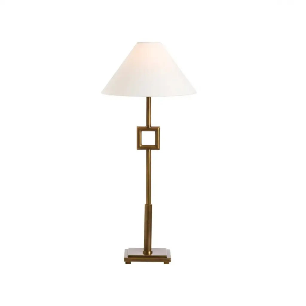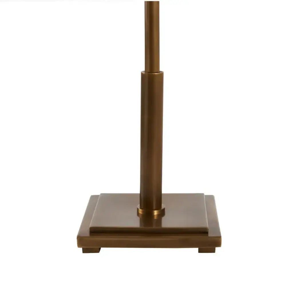 This sleek metal table lamp features a modern silhouette with a bold square accent, adding a touch of architectural elegance. Finished in a rich aged brass, it exudes warmth and sophistication, making it a perfect statement piece for any contemporary or classic space. Designed by Jamie Merida.